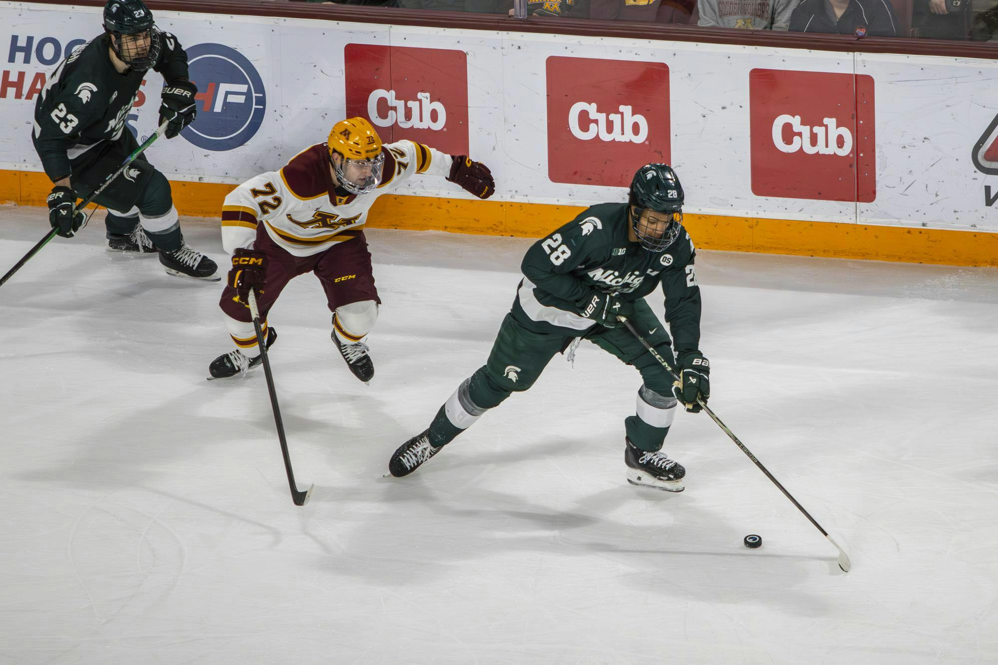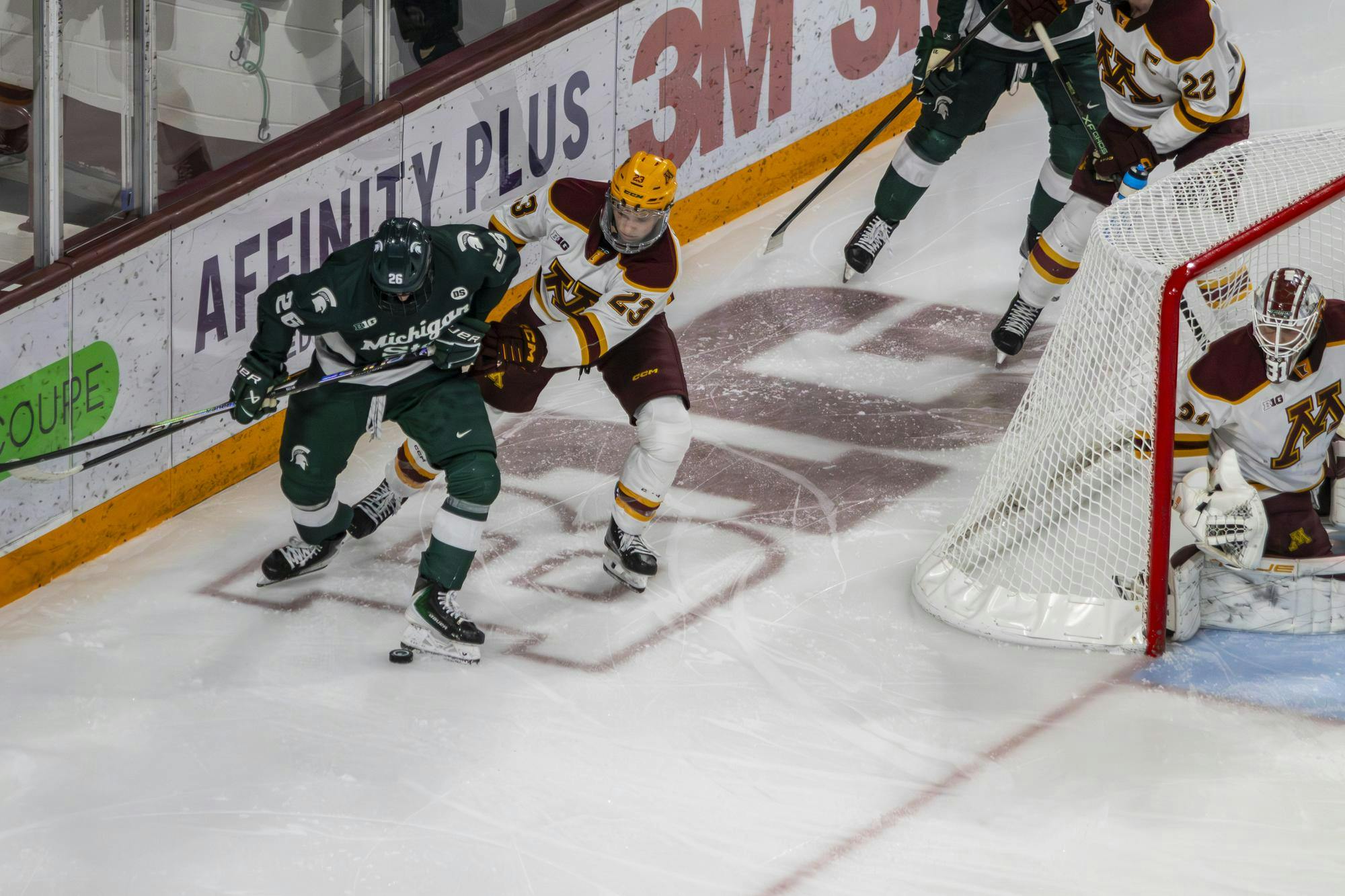 Minnesota forward Javon Moore scored the shootout-winning goal as the Gophers’ second shooter. Senior forward Daniel Russell was the only Spartan to convert in the shootout.