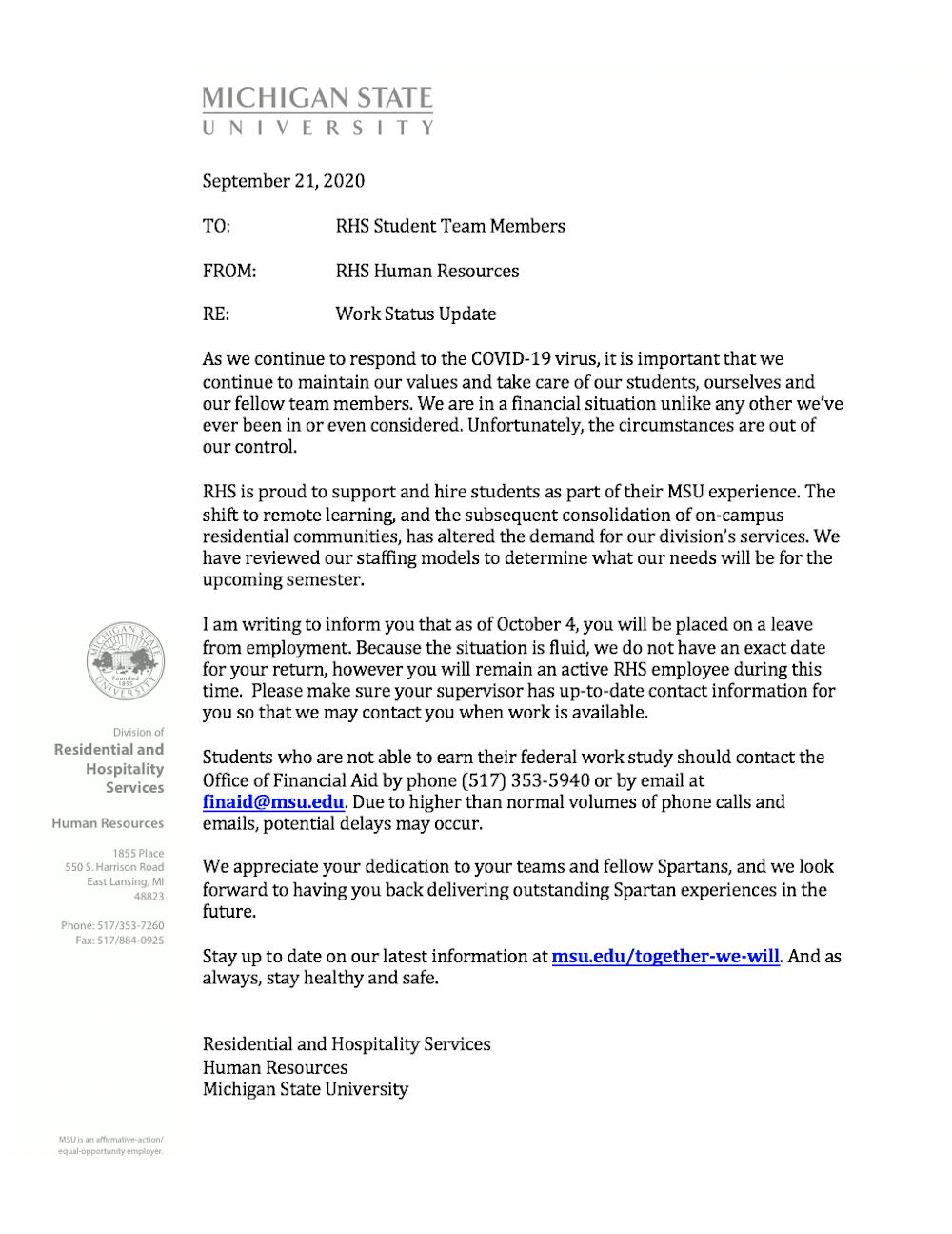 Michigan State Residential and Hospitality Services, or RHS, student employees were notified Monday that they would be placed on a leave beginning Oct. 4, according to a letter from RHS Human Resources.