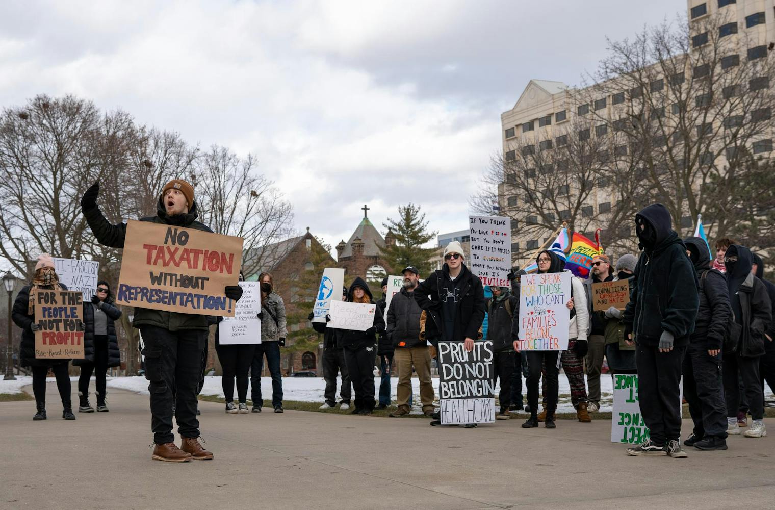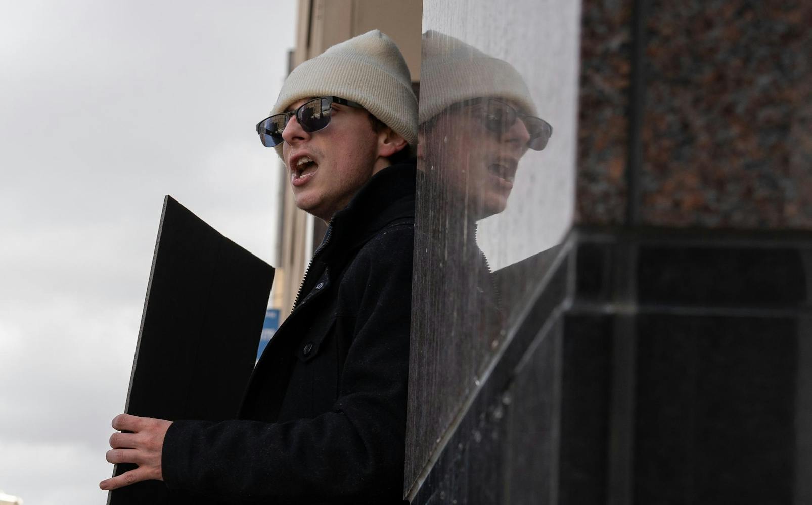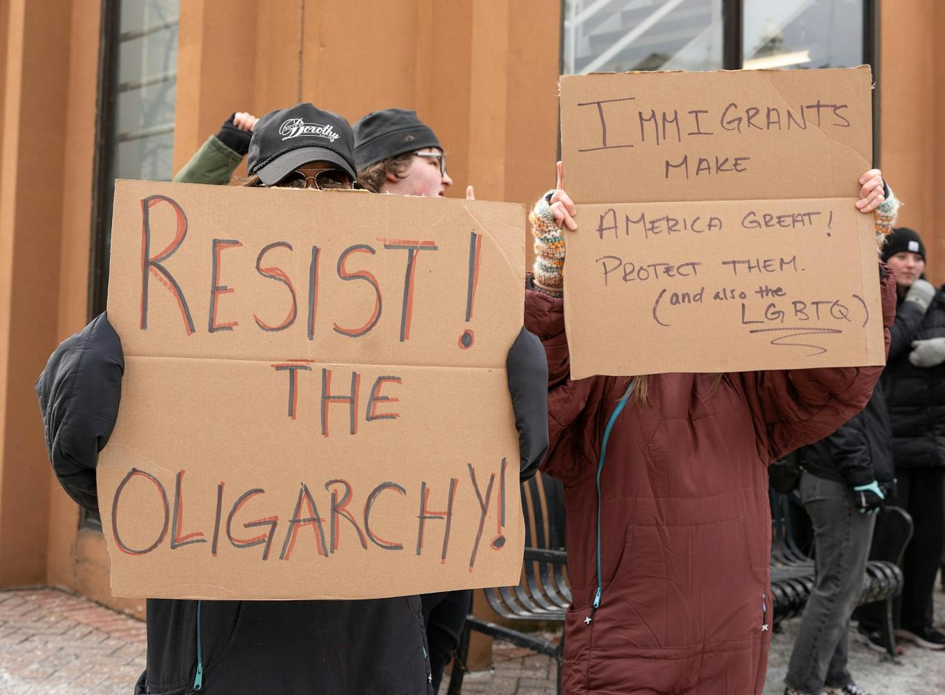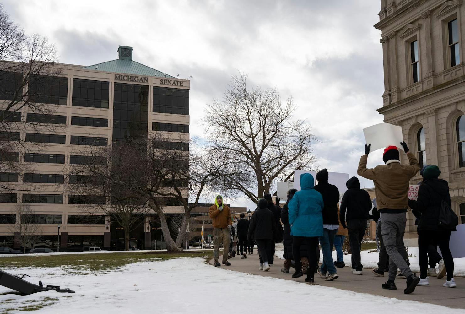 Protesters rally outside the Michigan State Capitol in Lansing on Jan. 29, 2025. The demonstration was organized via TikTok and other social media platforms, aiming to oppose fascism and advocate for human rights.