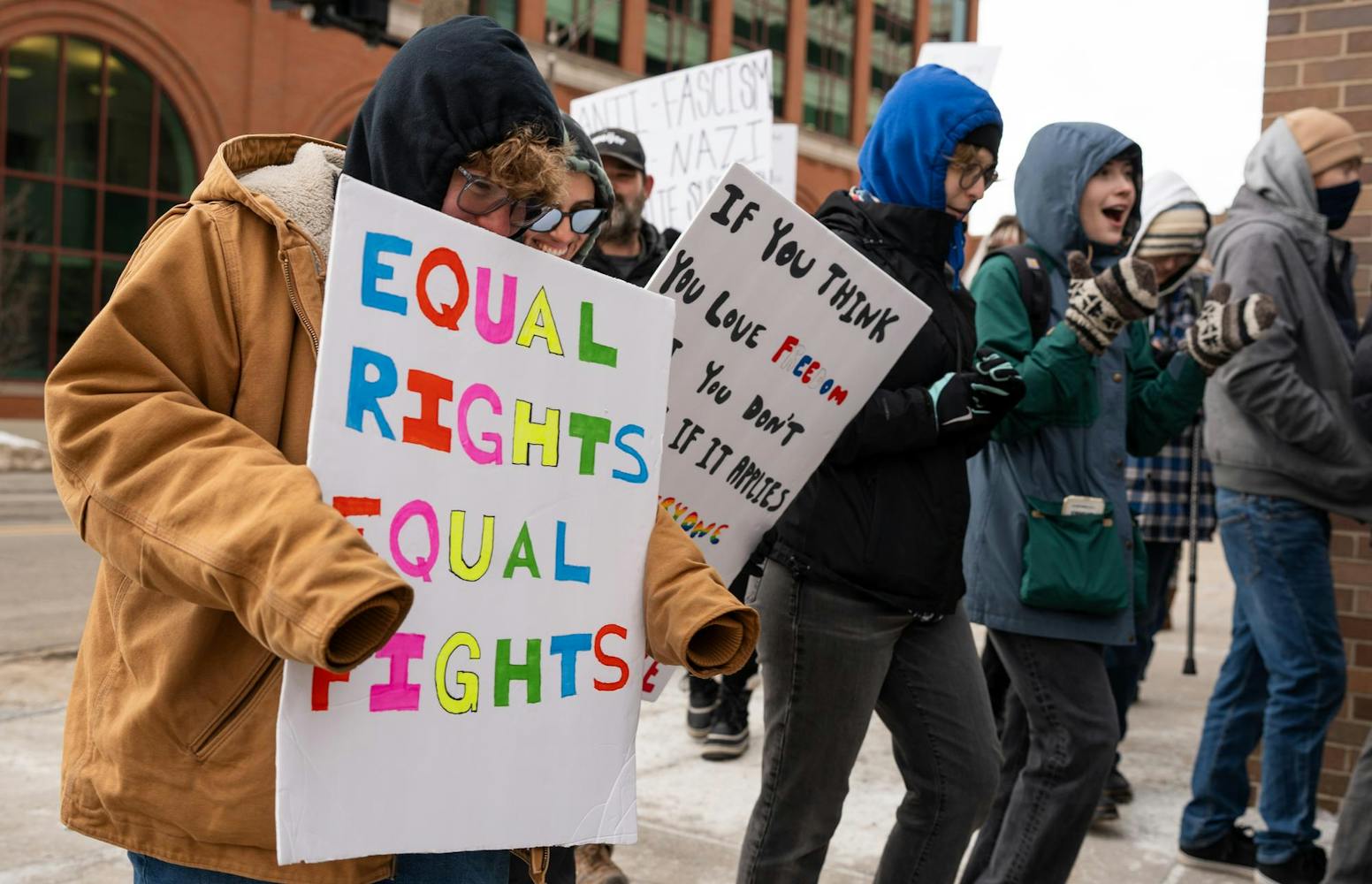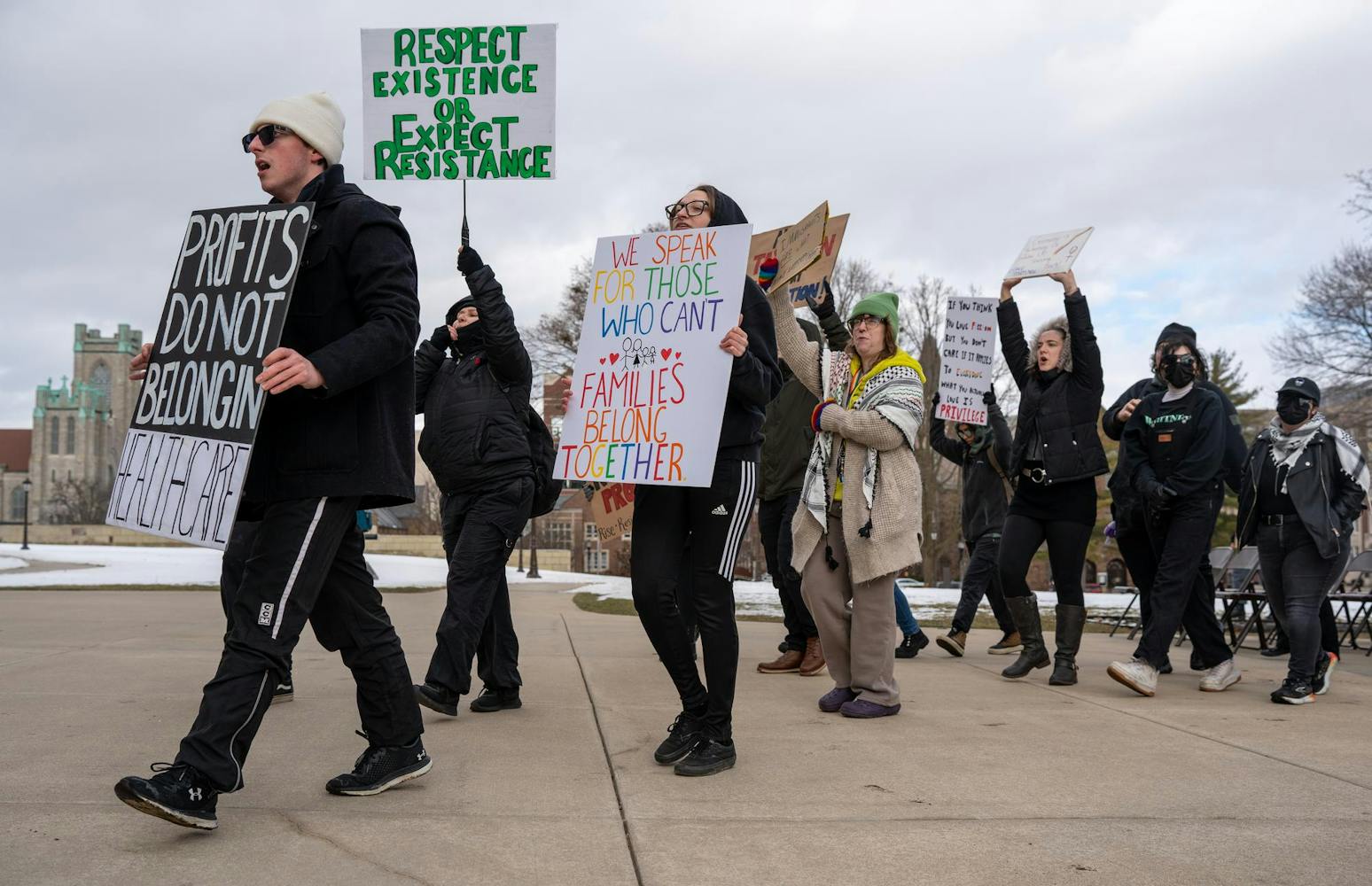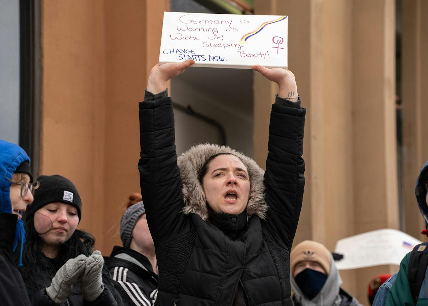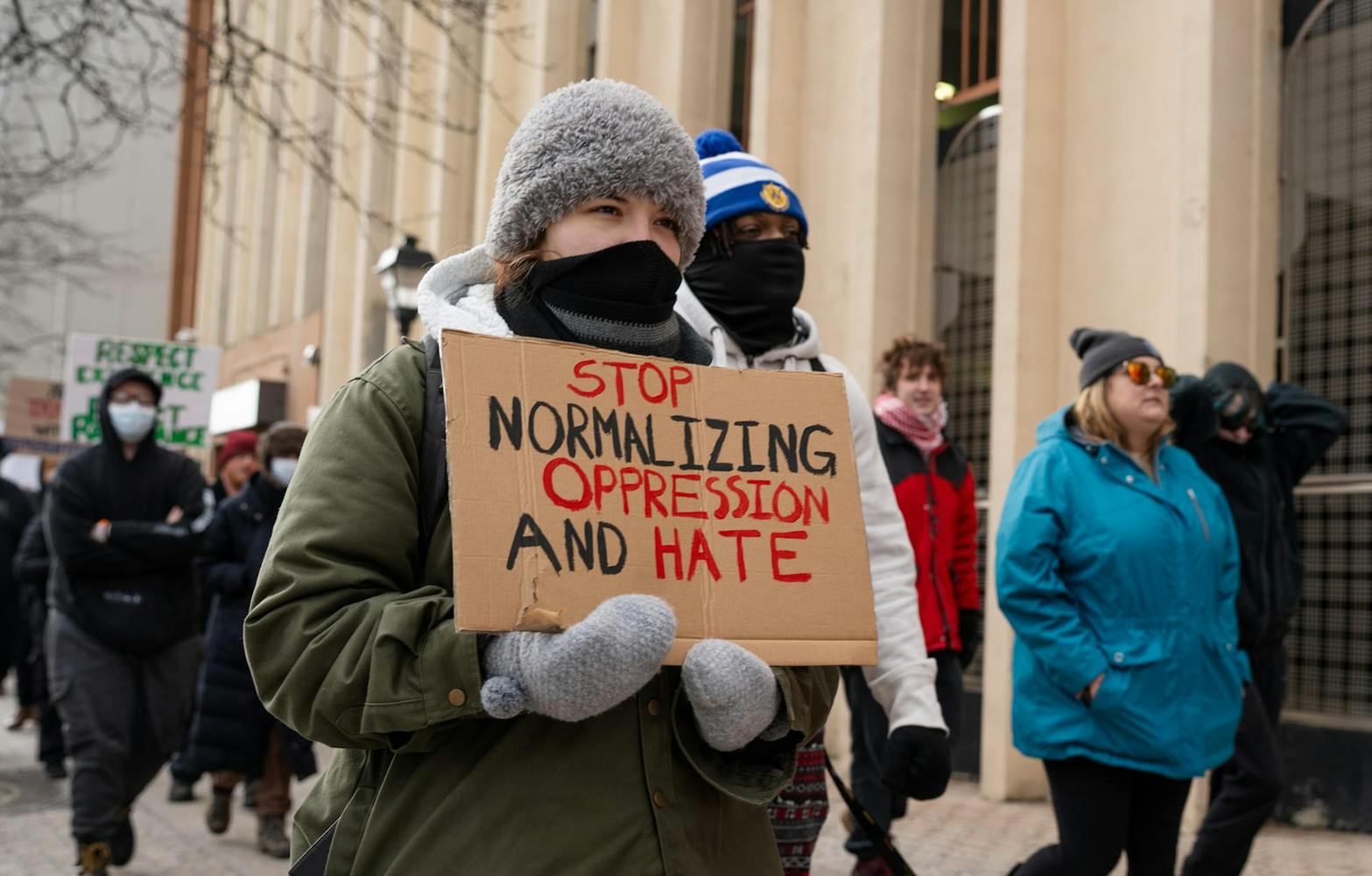 Protesters rally outside the Michigan State Capitol in Lansing on Jan. 29, 2025. The demonstration was organized via TikTok and other social media platforms, aiming to oppose fascism and advocate for human rights.
