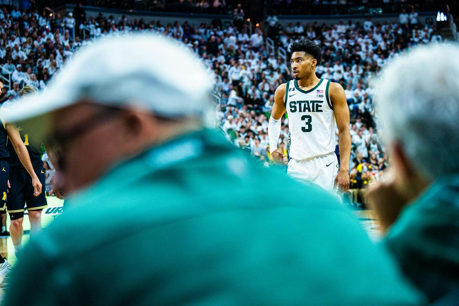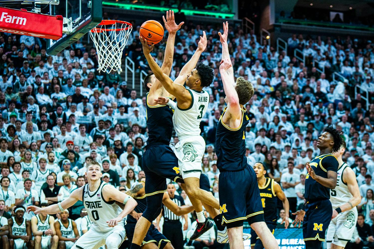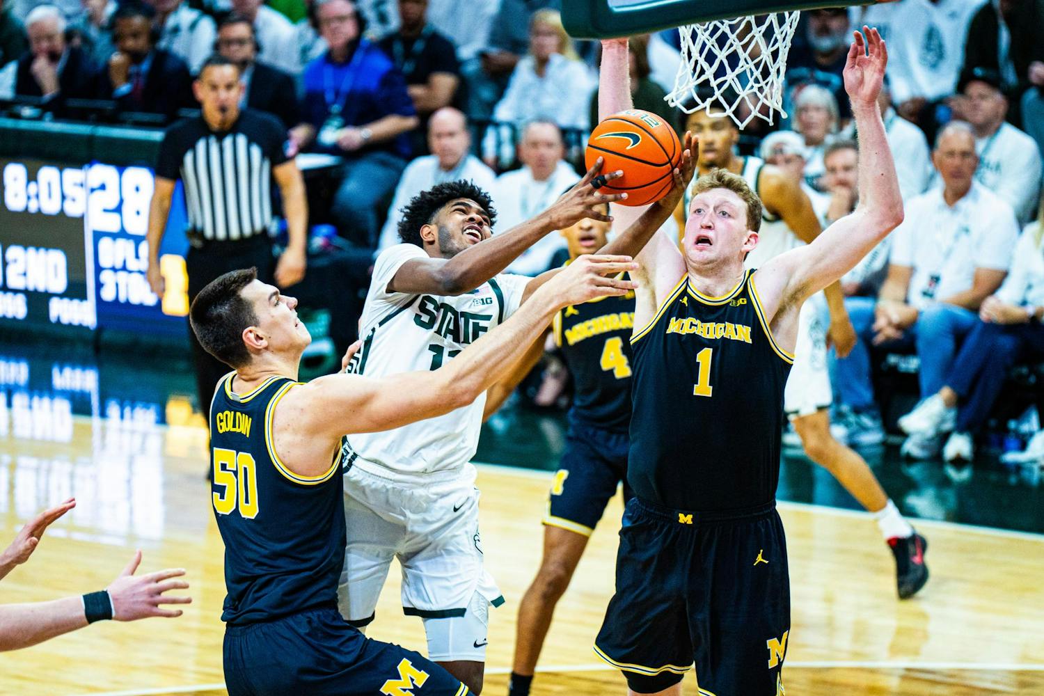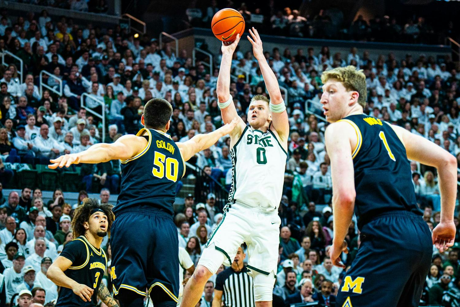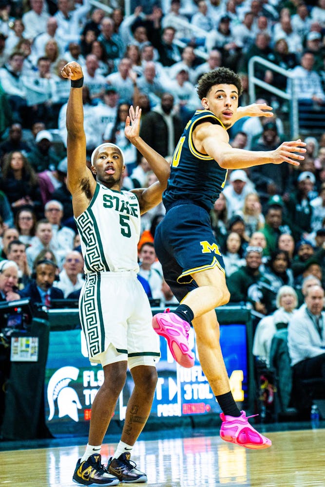 MSU men's basketball showed out against University of Michigan, earning both a 79-62 victory and the Big Ten regular season title at the Breslin Center on March 9, 2025. This is their seventh straight win and second victory over Michigan this season. It was also Senior Day, which saw celebrations take place for the three graduating seniors: guard Jaden Akins, forward Frankie Fidler and center Szymon Zapala.