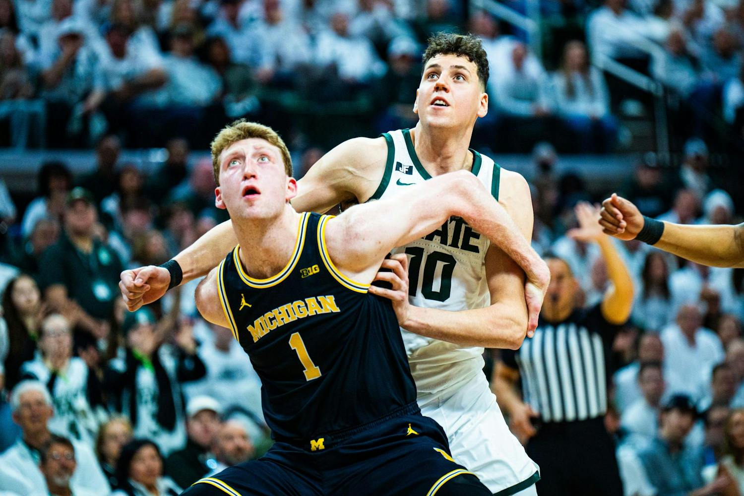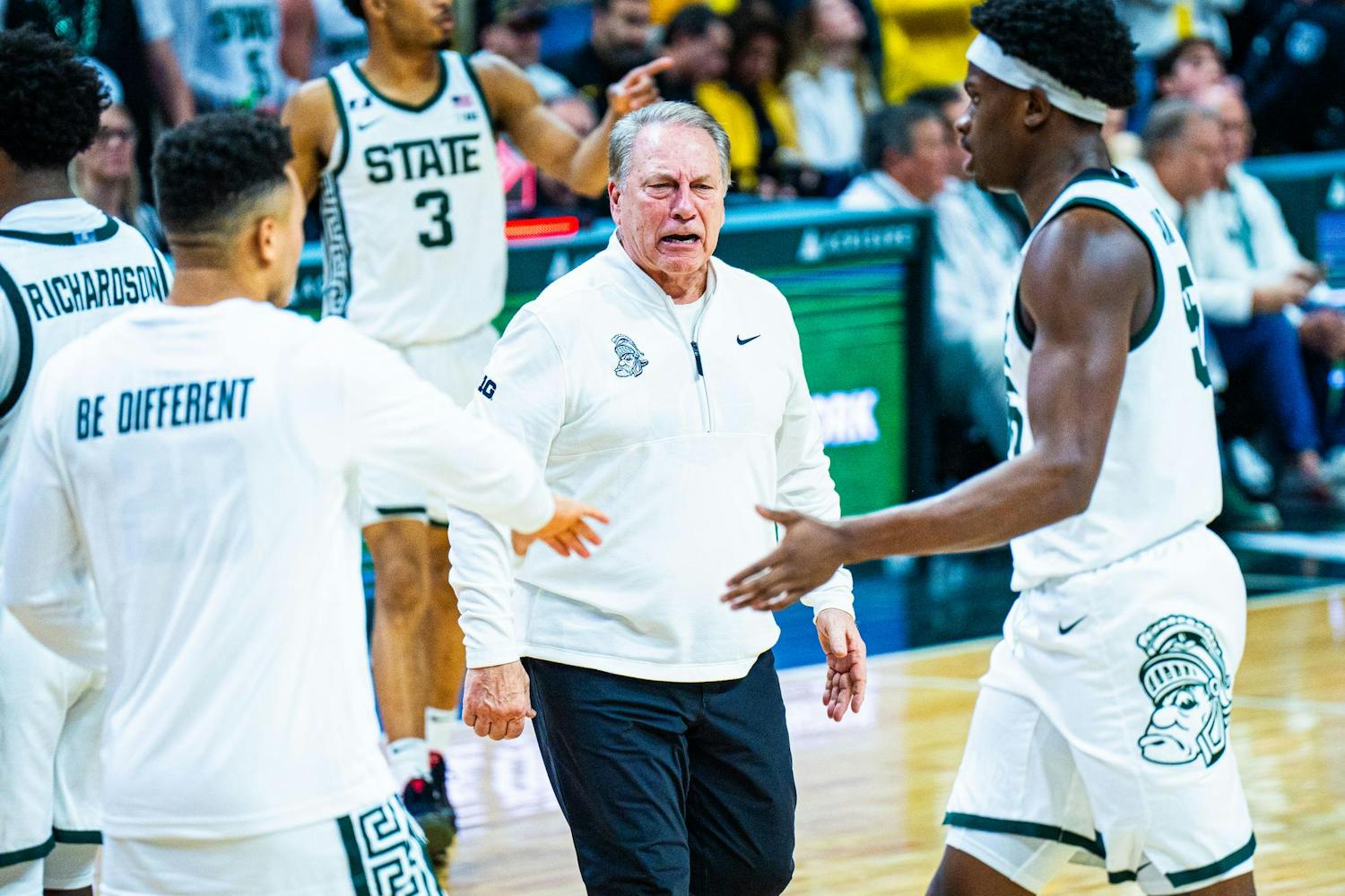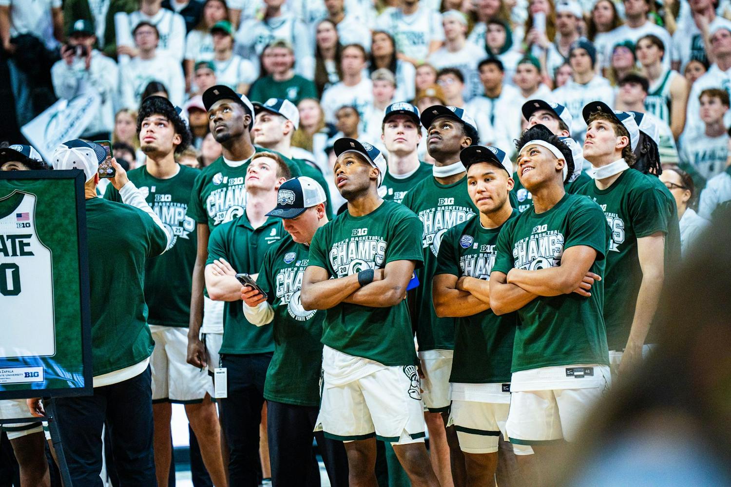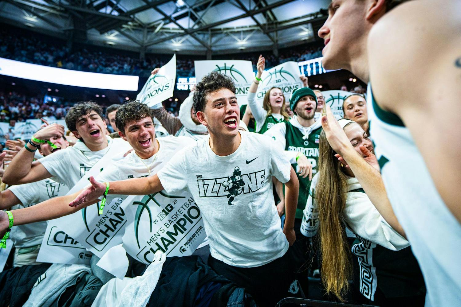 MSU men's basketball showed out against University of Michigan, earning both a 79-62 victory and the Big Ten regular season title at the Breslin Center on March 9, 2025. This is their seventh straight win and second victory over Michigan this season. It was also Senior Day, which saw celebrations take place for the three graduating seniors: guard Jaden Akins, forward Frankie Fidler and center Szymon Zapala.