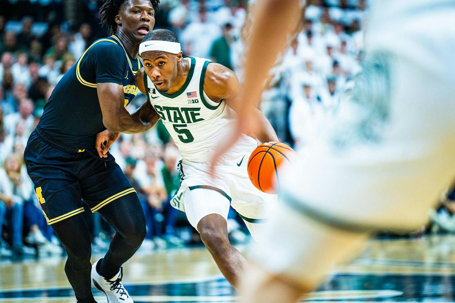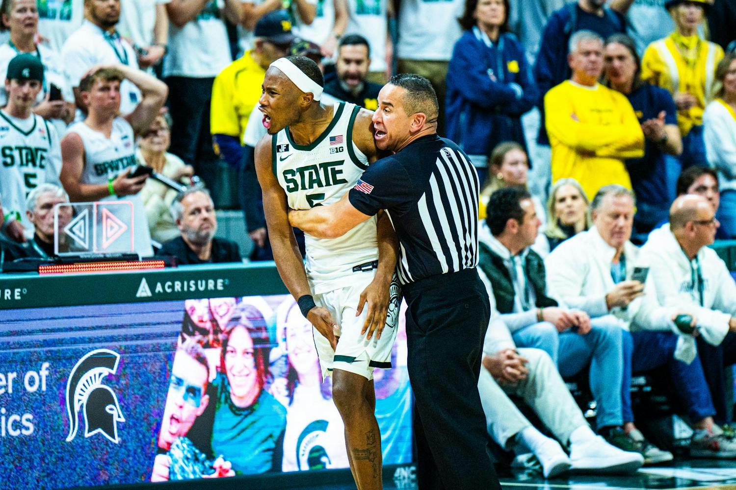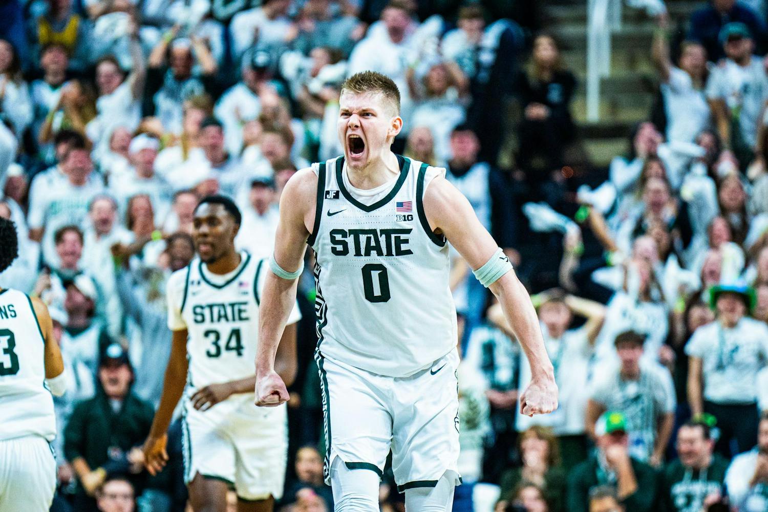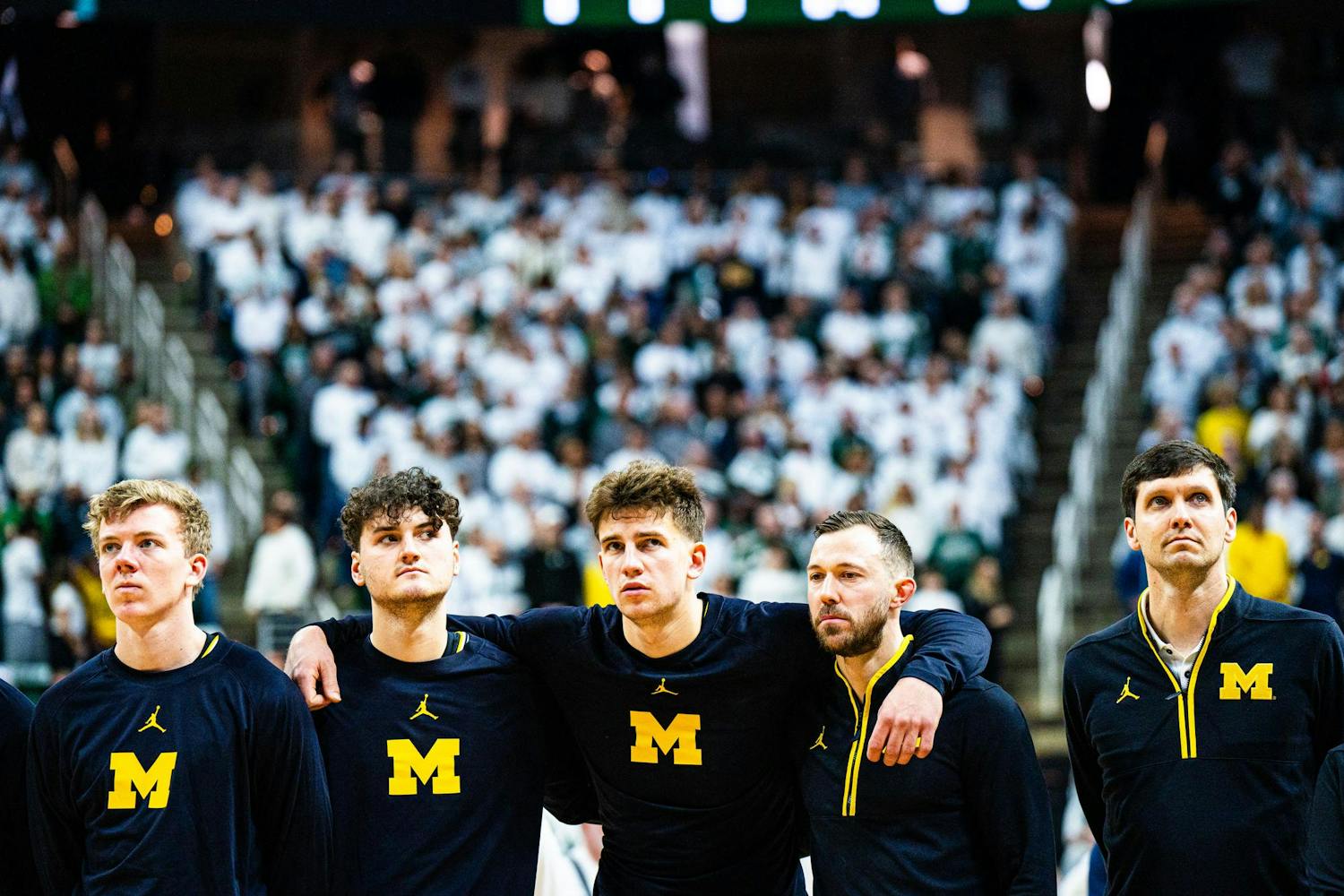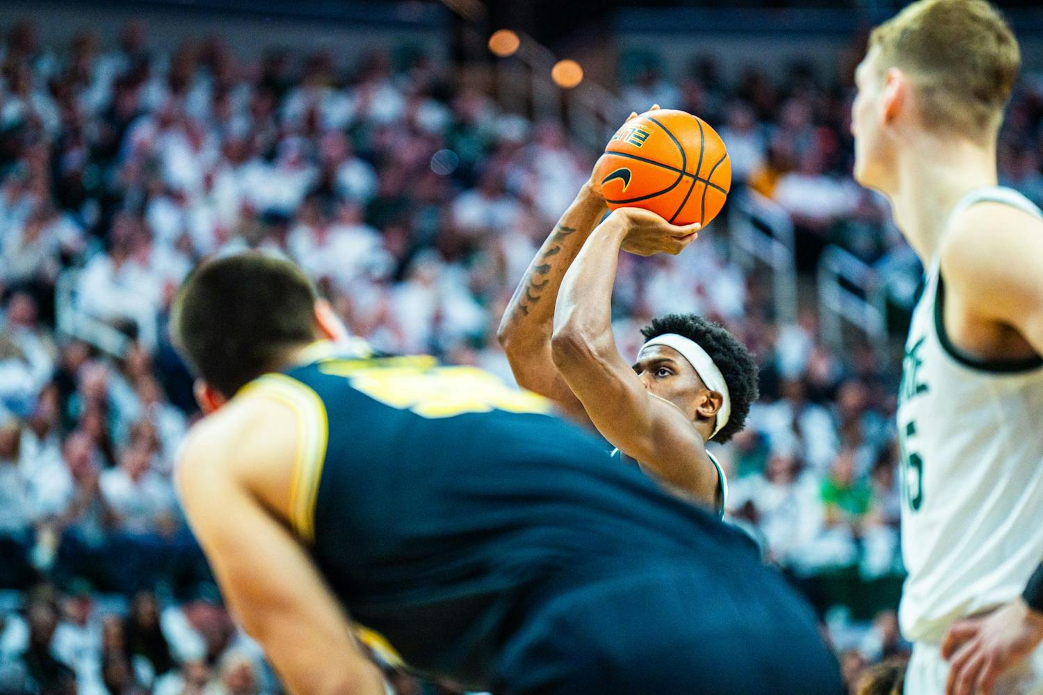 MSU men's basketball showed out against University of Michigan, earning both a 79-62 victory and the Big Ten regular season title at the Breslin Center on March 9, 2025. This is their seventh straight win and second victory over Michigan this season. It was also Senior Day, which saw celebrations take place for the three graduating seniors: guard Jaden Akins, forward Frankie Fidler and center Szymon Zapala.