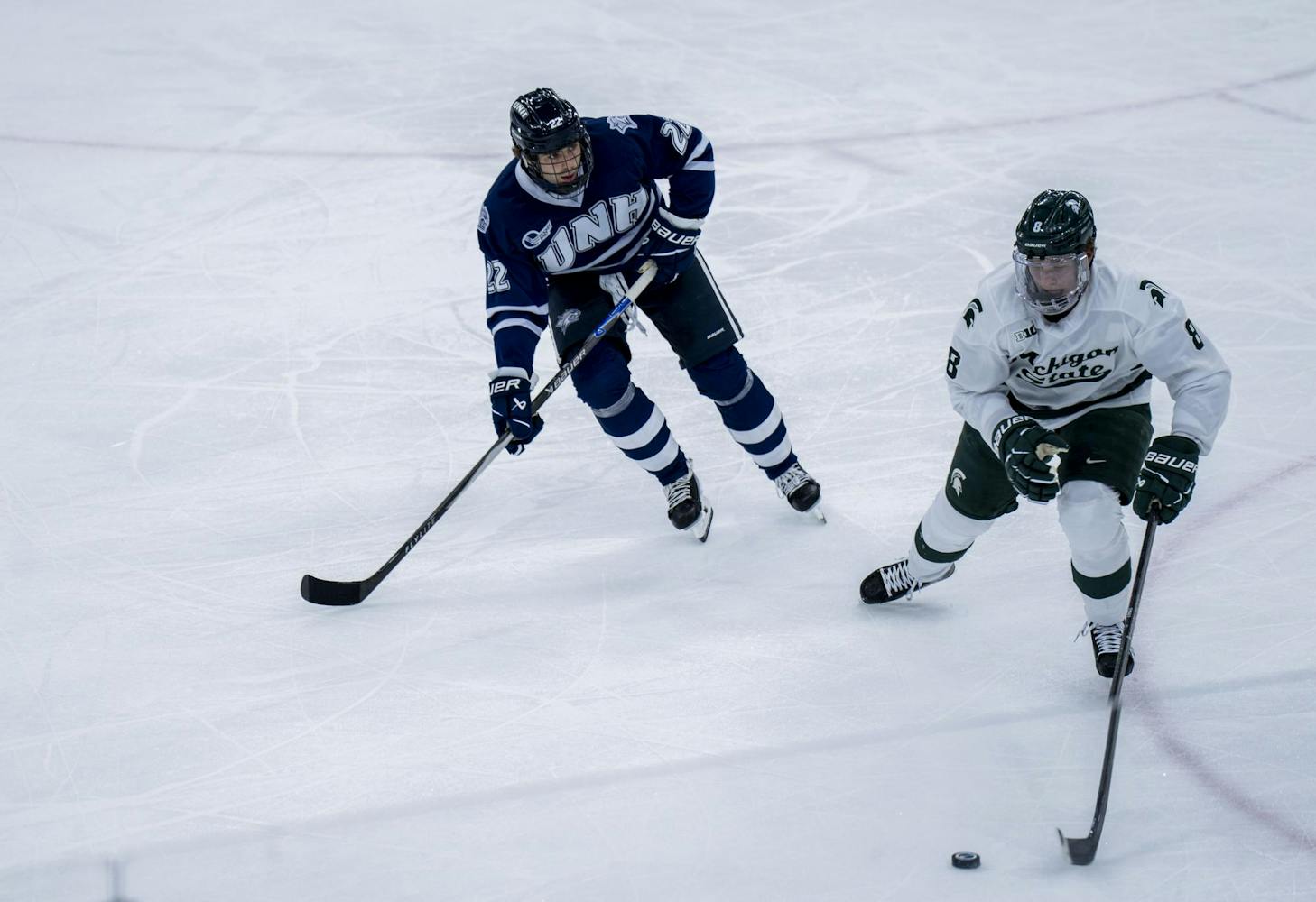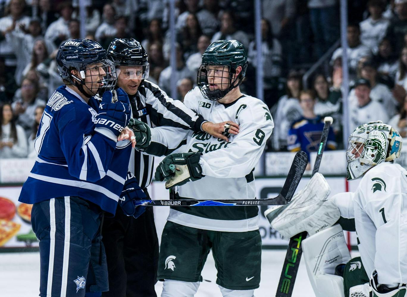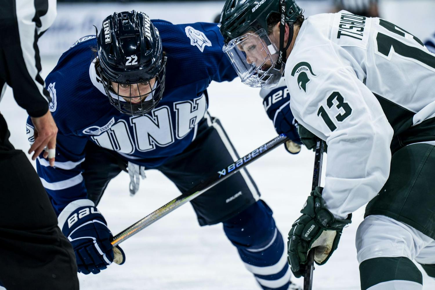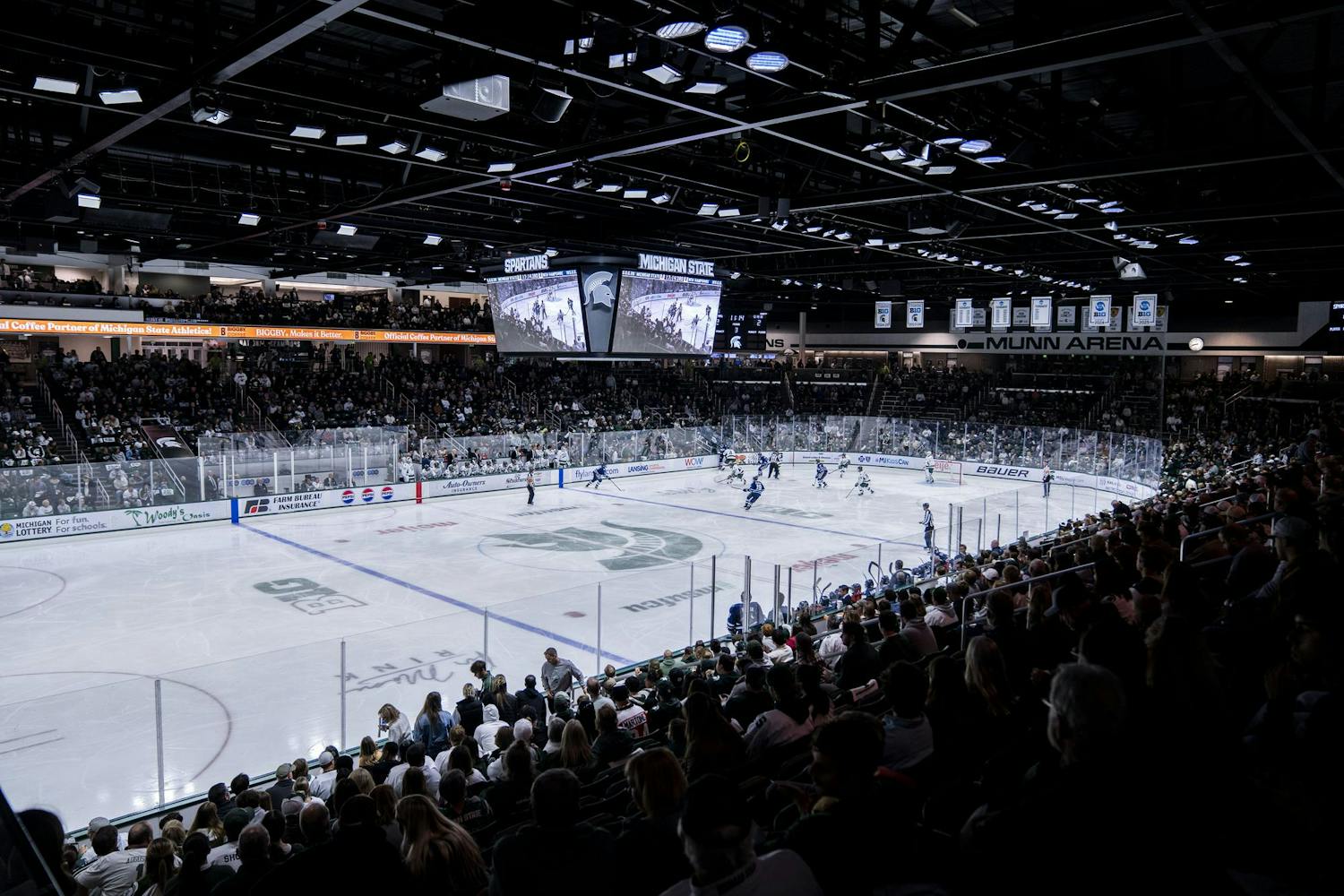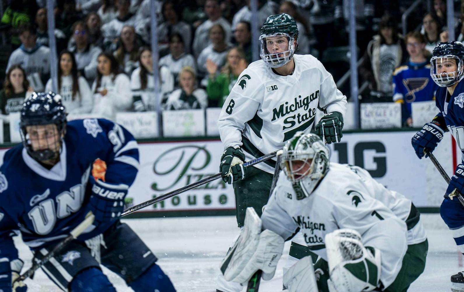 MSU men's hockey falls to New Hampshire during their first game of the season in the Munn Ice Arena in East Lansing, Michigan on Oct. 9, 2025. After a close match MSU men's hockey lost 4-3 in the final seconds of the game.