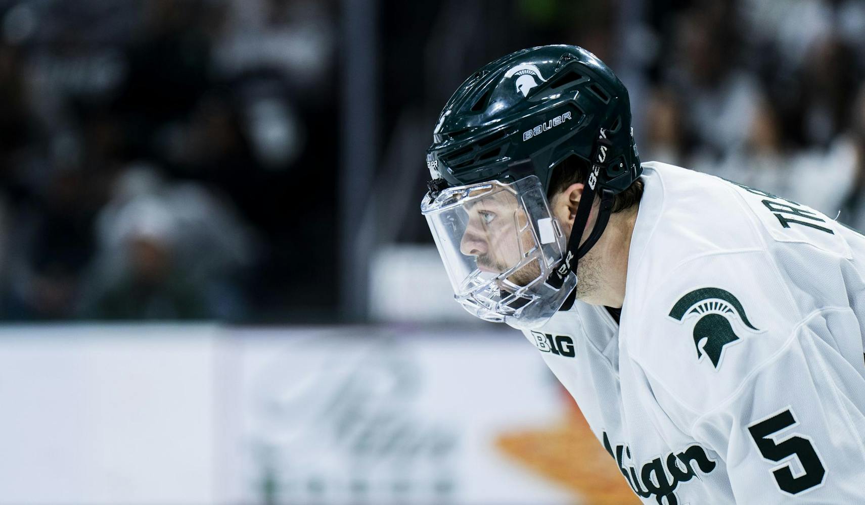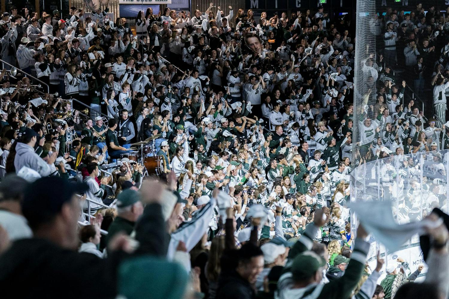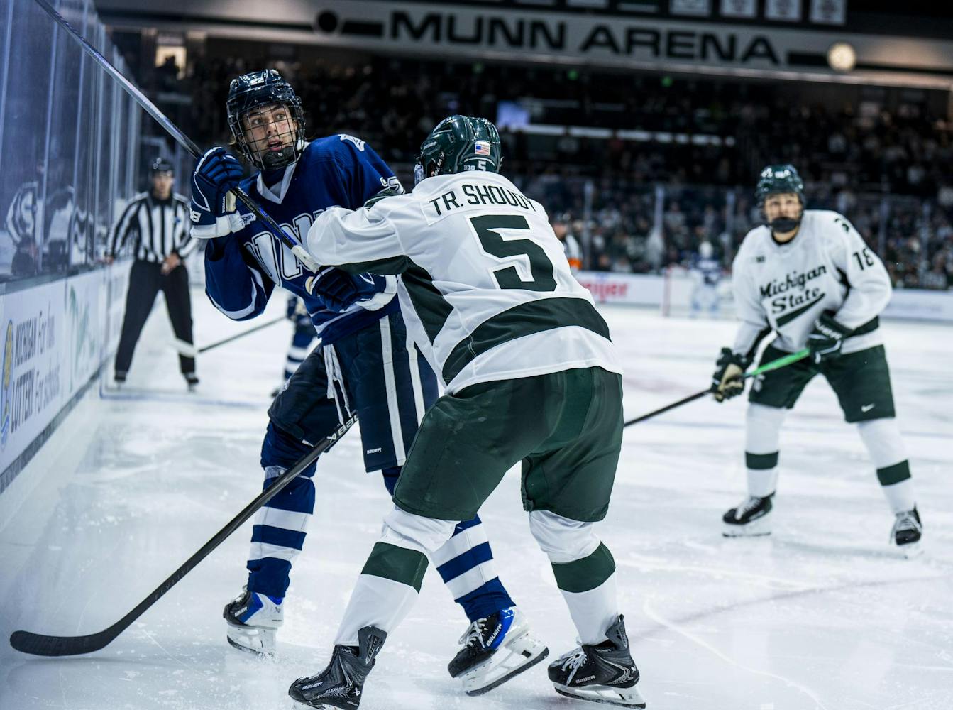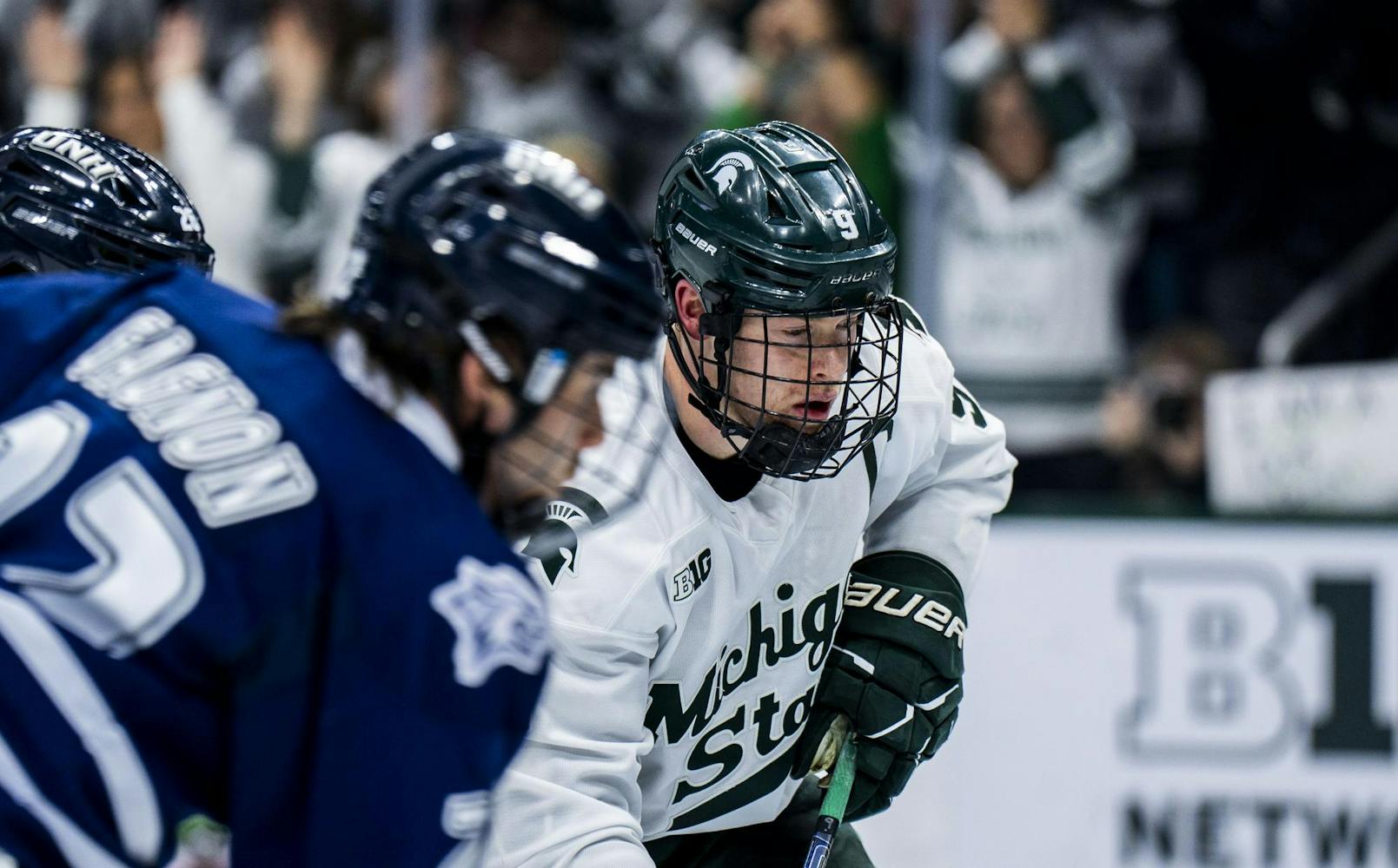 MSU men's hockey falls to New Hampshire during their first game of the season in the Munn Ice Arena in East Lansing, Michigan on Oct. 9, 2025. After a close match MSU men's hockey lost 4-3 in the final seconds of the game.