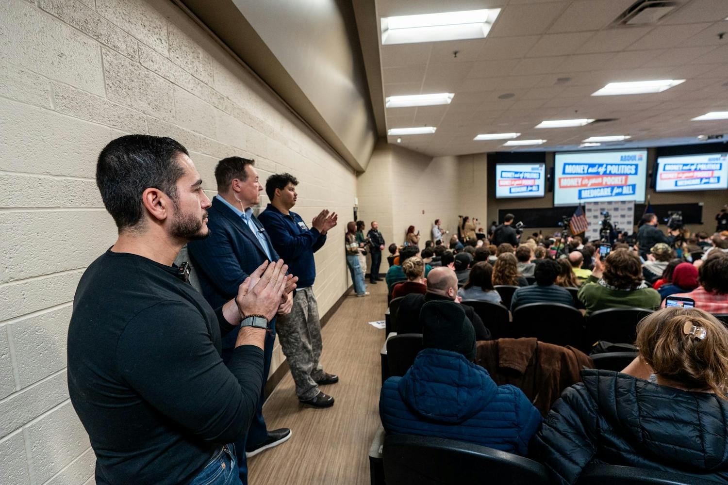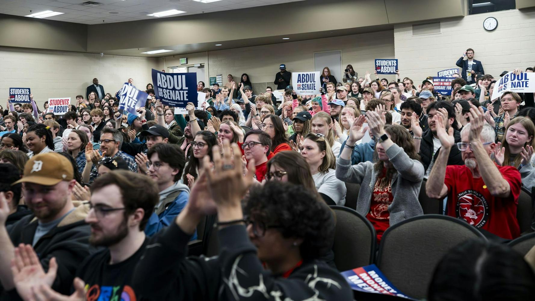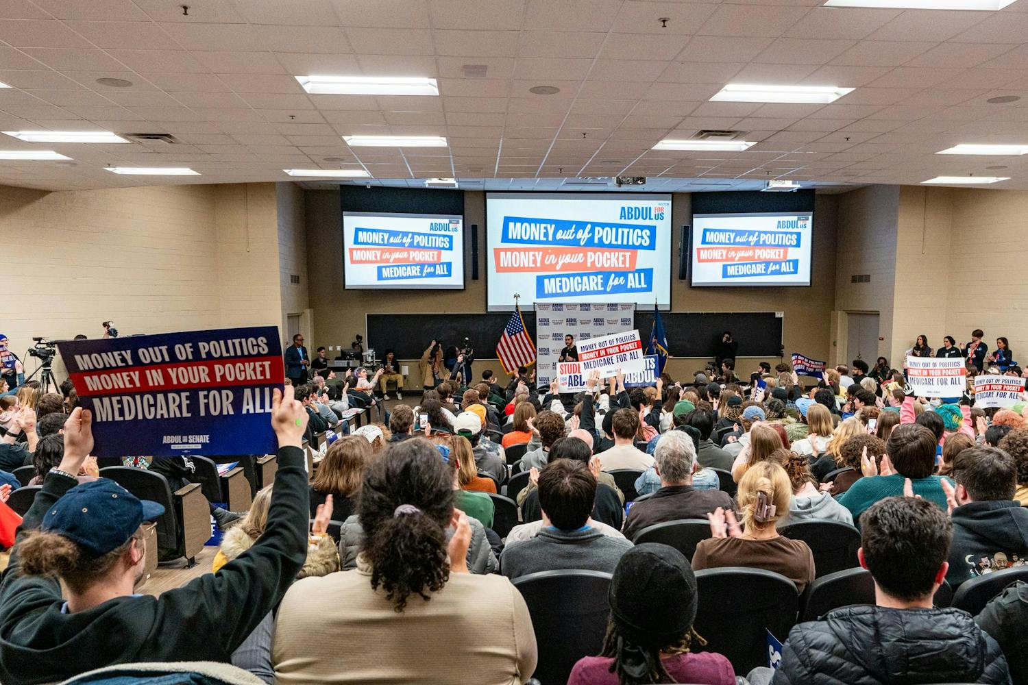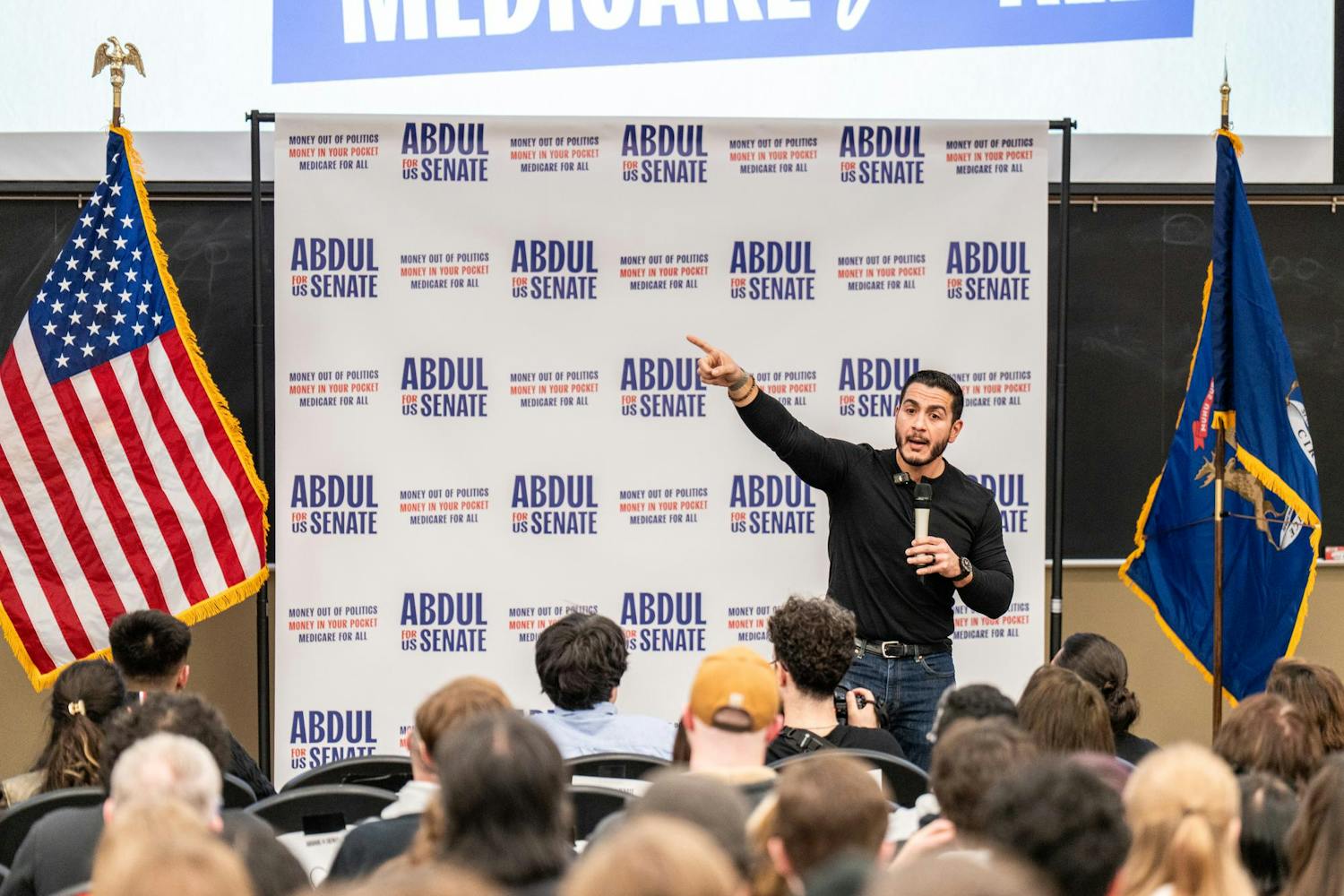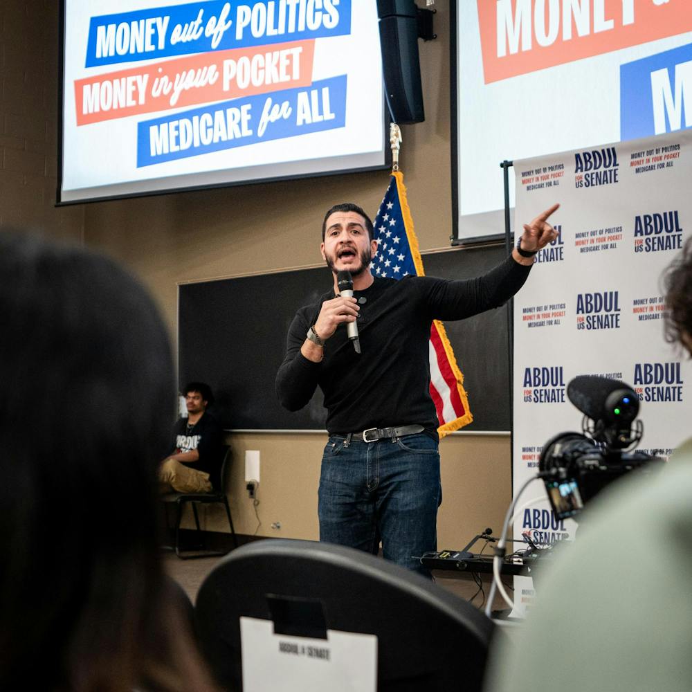 Abdul El-Sayed – a candidate for the upcoming 120th Senate – holds a rally for his 'Abdul for U.S. Senate' campaign in Michigan State University's Anthony Hall in East Lansing, MI on April 7, 2026. Attendees gather to hear his campaign efforts, as he spoke about federal funding and healthcare issues. El-Sayed brought along two endorsers of his campaign, popular leftist commentator Hasan Piker and Congresswomen Summer Lee – both of whom speak about and support Abdul's goals as his campaign continues.