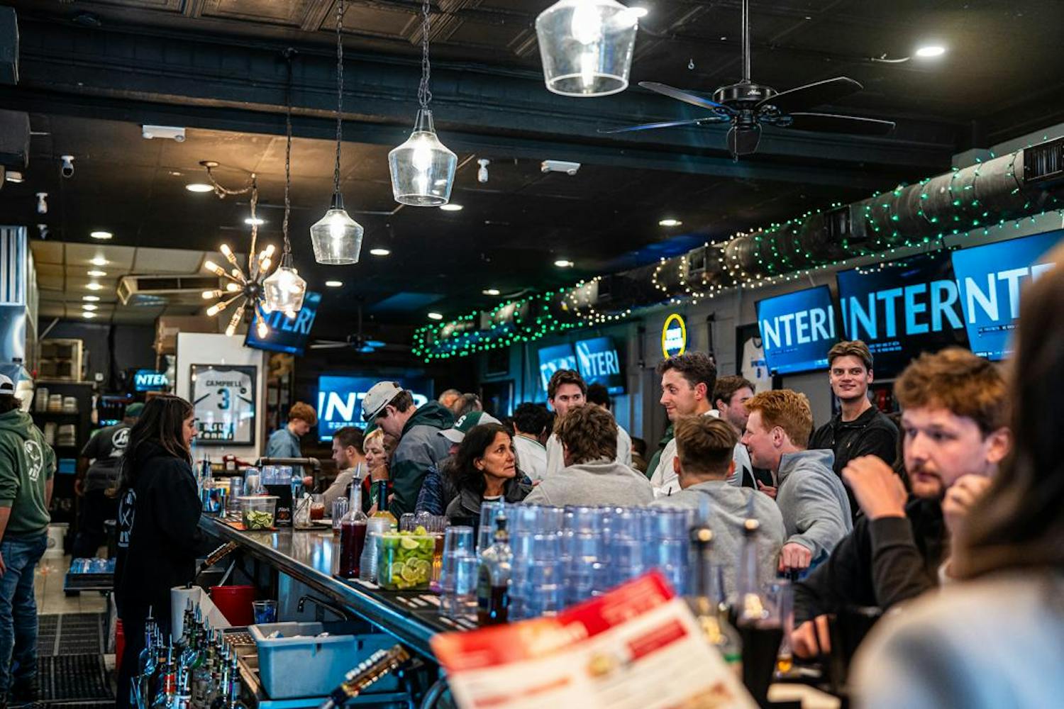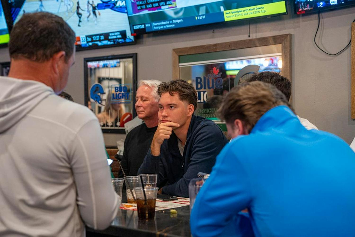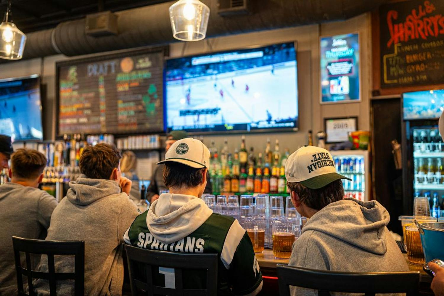 Michigan State hockey fans watch the NCAA mens hockey regional final inside Lou & Harry's Bar and Grill in East Lansing, MI on March 28, 2026. Fans are left in dissatisfaction as MSU loses to Wisconsin 4-3 in overtime after being ahead by 2 goals with 5 minutes left in the third period.