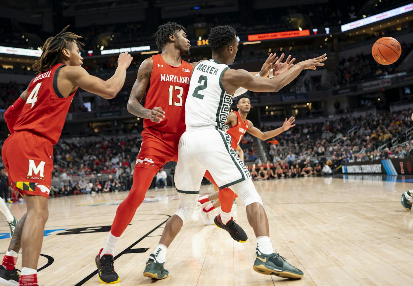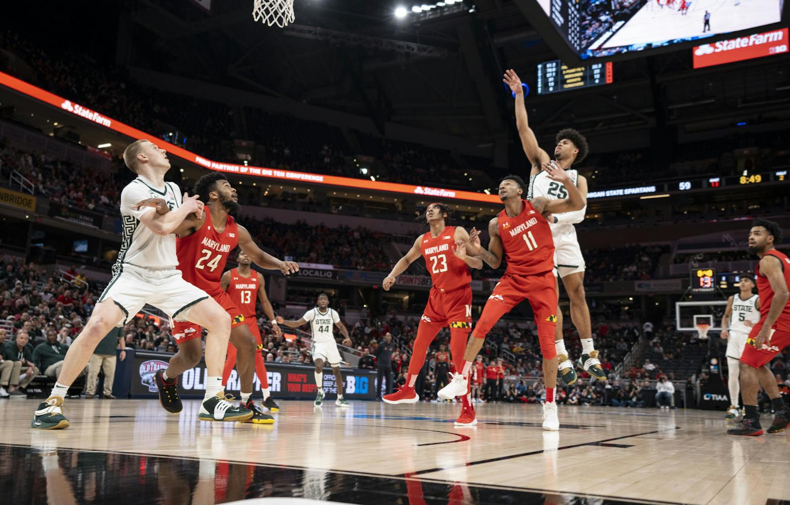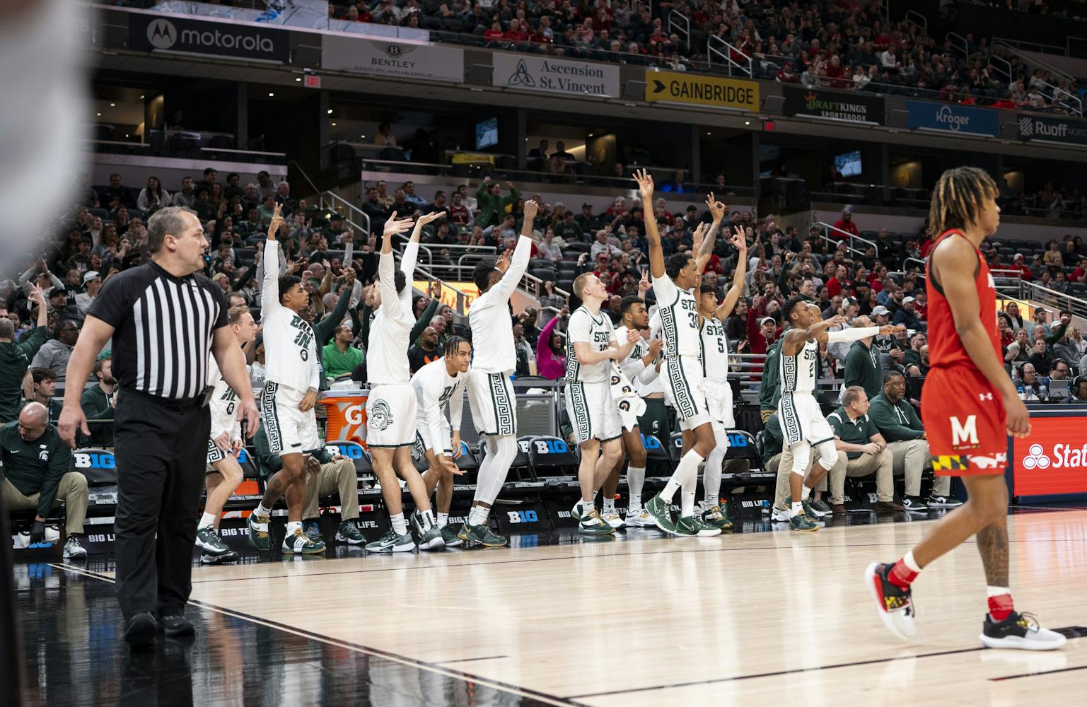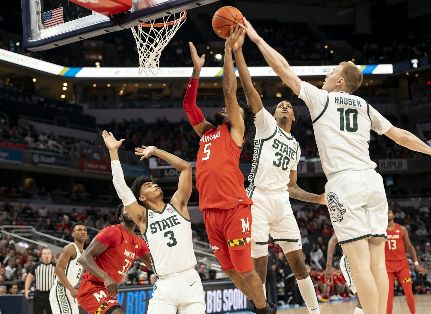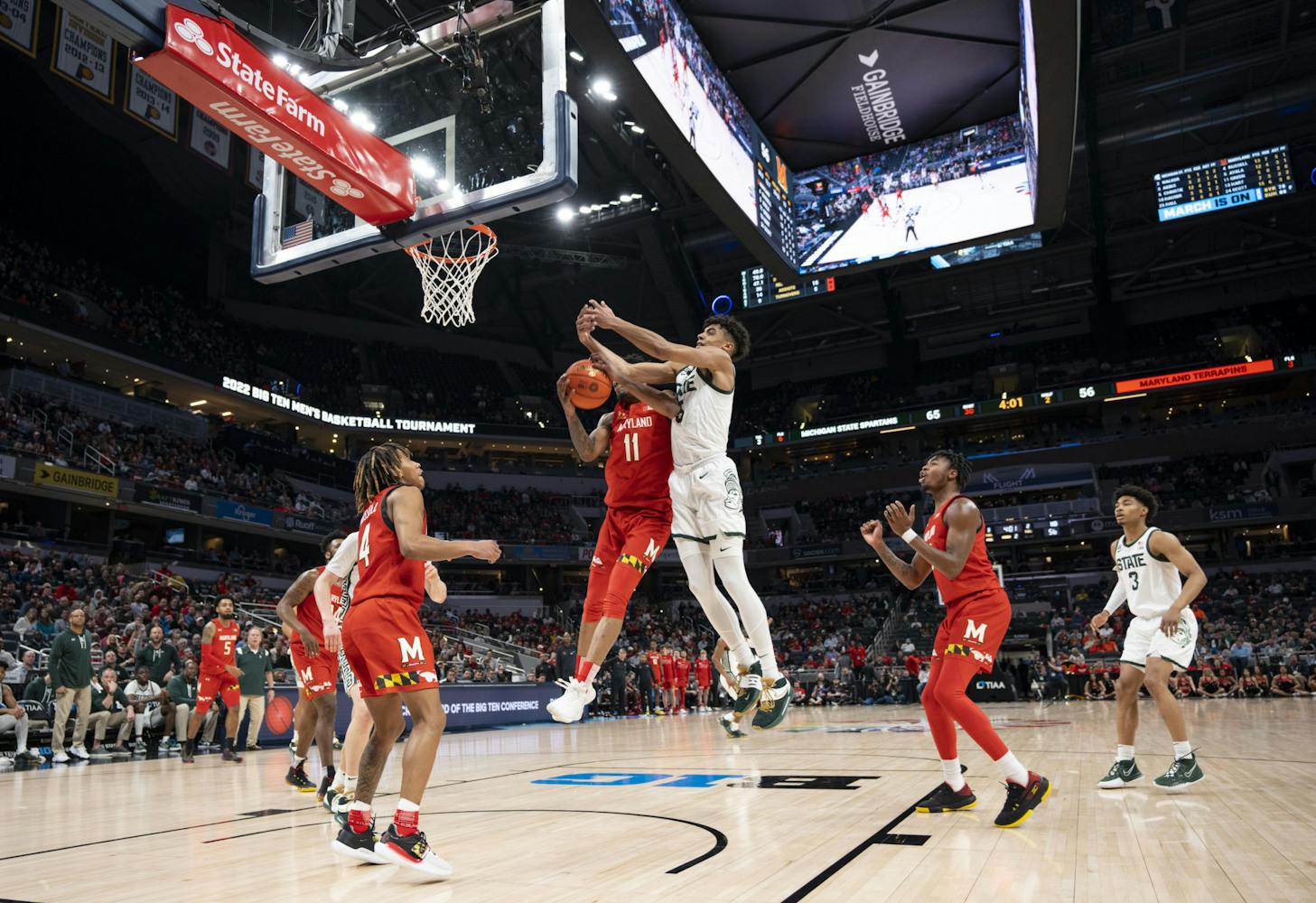 The Michigan State Spartans took on the Maryland Terrapins at Gainbridge Fieldhouse in the second round of the B1G Tournament in Indianapolis. Maryland managed to close a 20-point gap in the second half, but MSU held onto their lead for a Spartan win, 76-72.