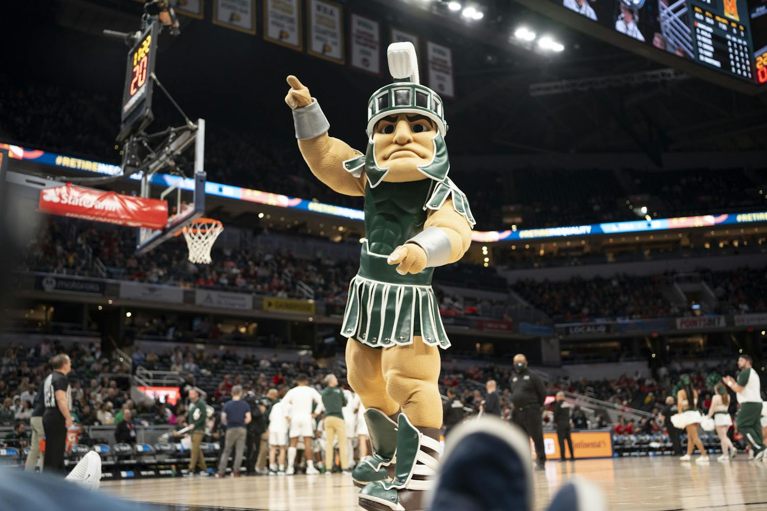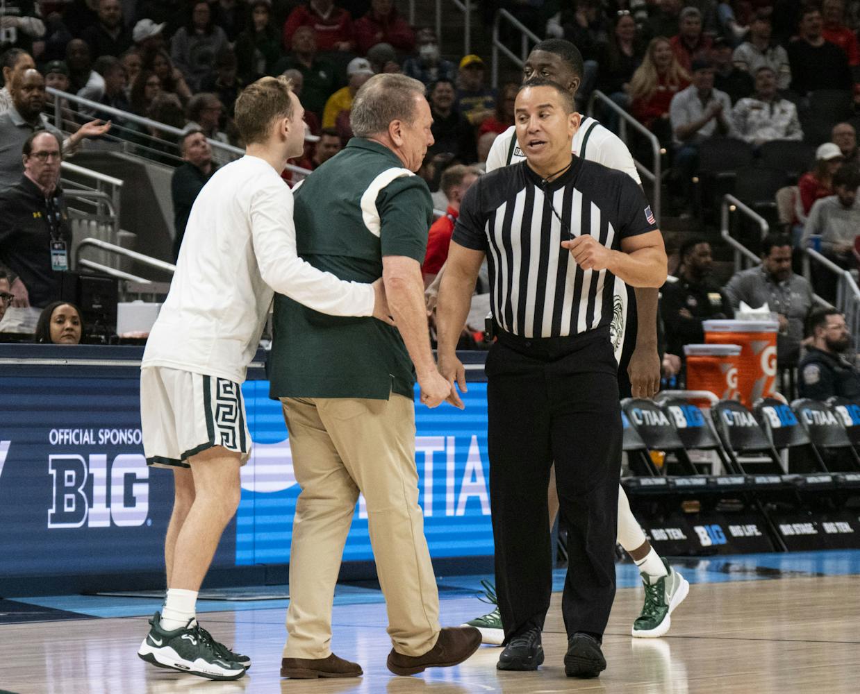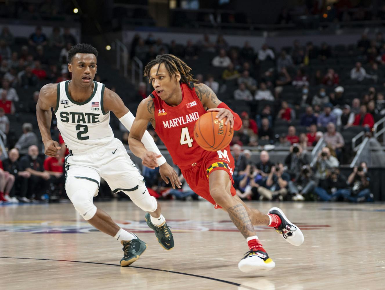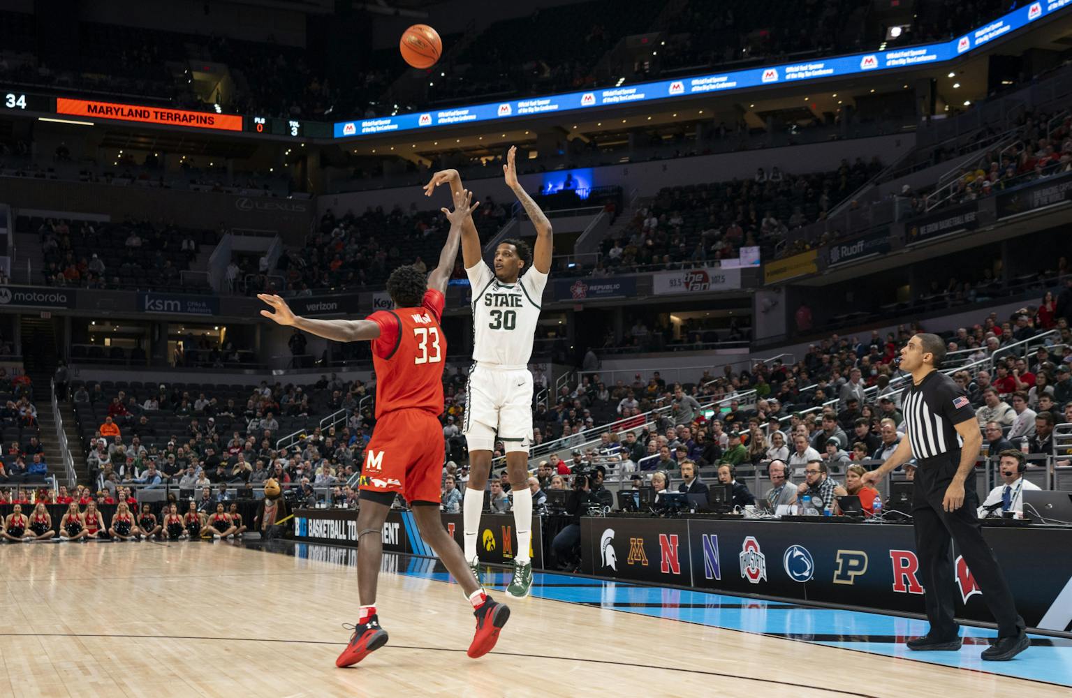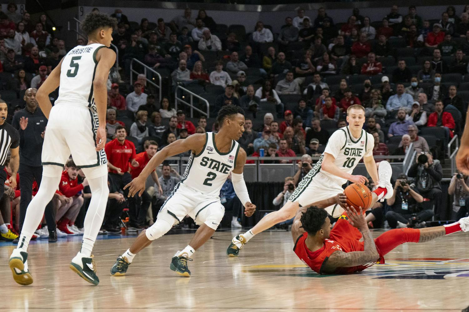 The Michigan State Spartans took on the Maryland Terrapins at Gainbridge Fieldhouse in the second round of the B1G Tournament in Indianapolis. Maryland managed to close a 20-point gap in the second half, but MSU held onto their lead for a Spartan win, 76-72.