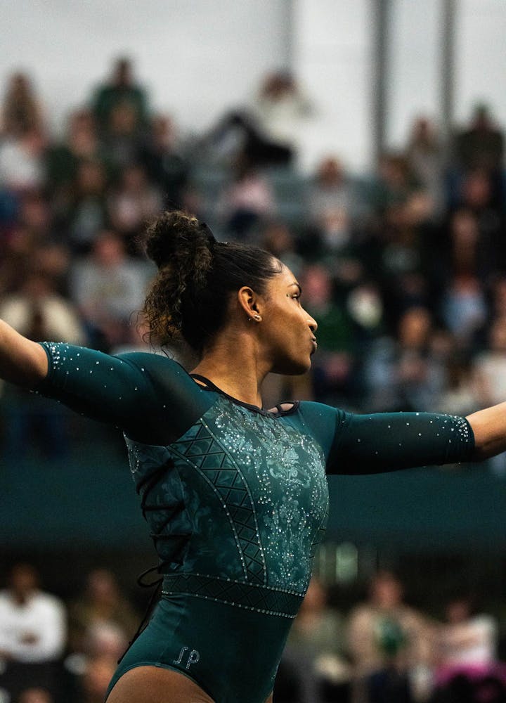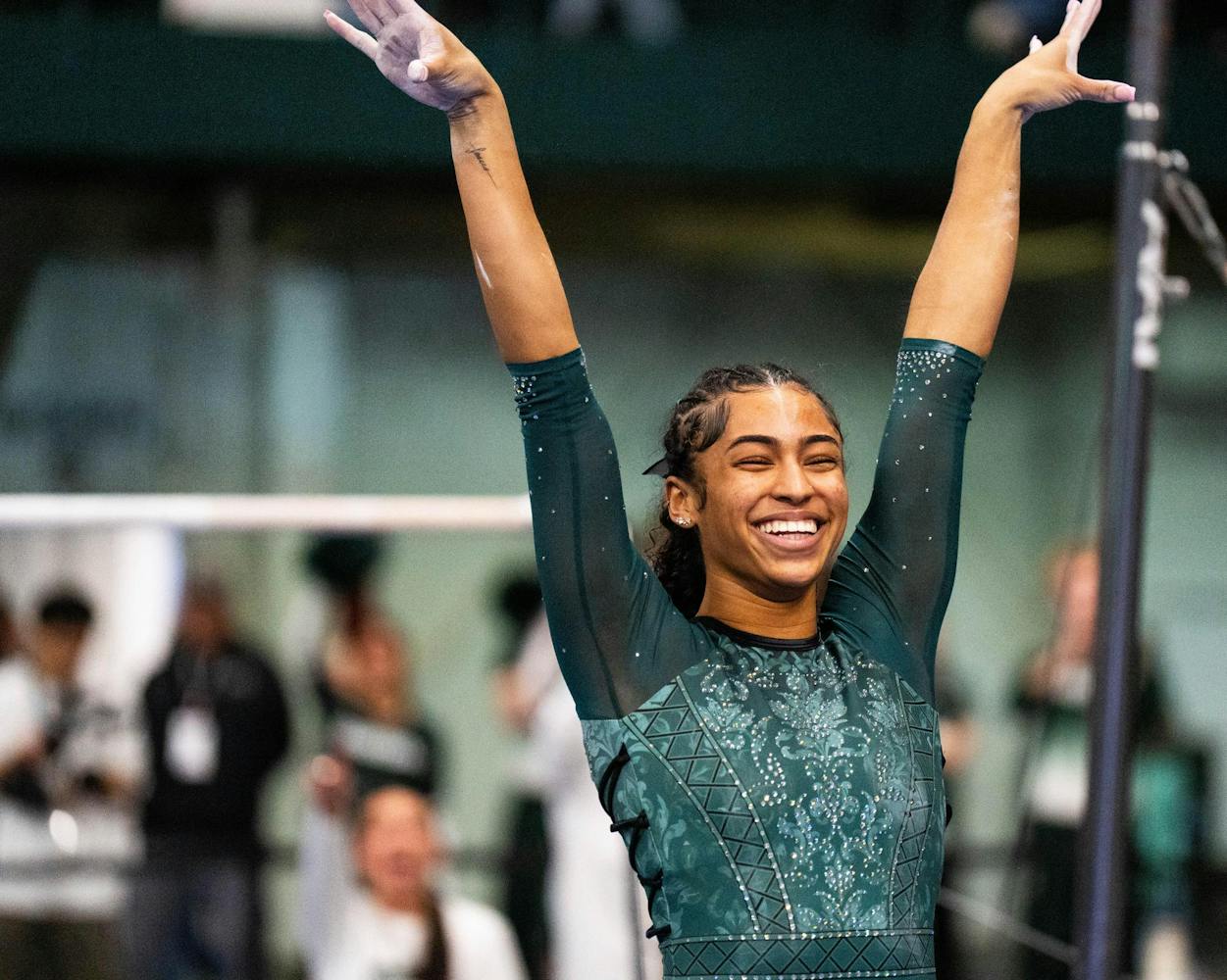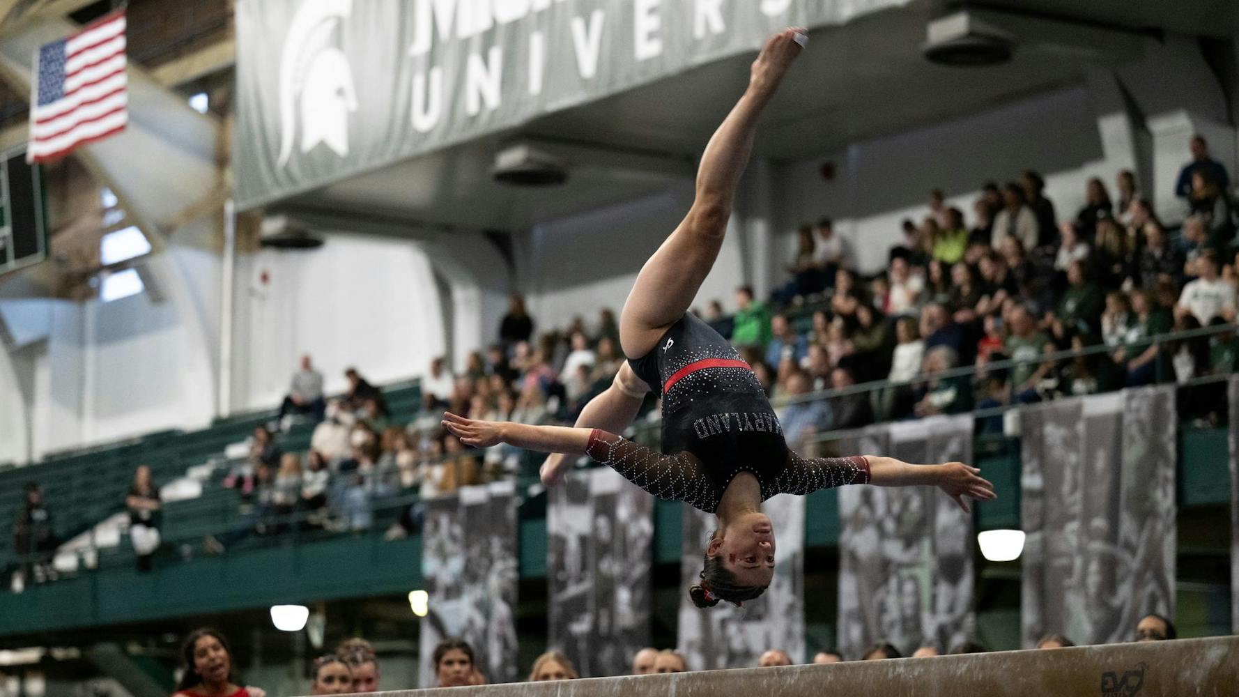 Michigan State gymnastics hosted Maryland and Western Michigan at Jenison Field House, earning a first-place finish with a team score of 197.250 on Sunday, Feb. 15, 2026. The Spartans led across multiple events in front of a home crowd of 1,897 in East Lansing, closing the afternoon with strong performances on floor and balance beam to seal the win.