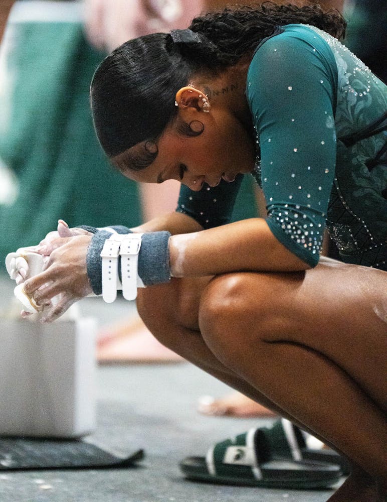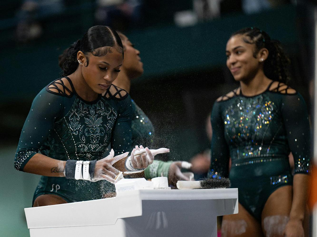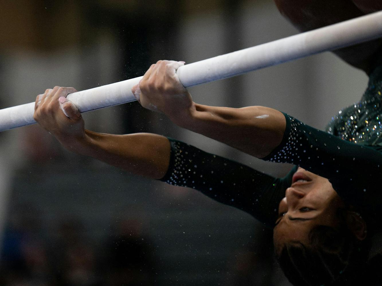 Michigan State gymnastics hosted Maryland and Western Michigan at Jenison Field House, earning a first-place finish with a team score of 197.250 on Sunday, Feb. 15, 2026. The Spartans led across multiple events in front of a home crowd of 1,897 in East Lansing, closing the afternoon with strong performances on floor and balance beam to seal the win.