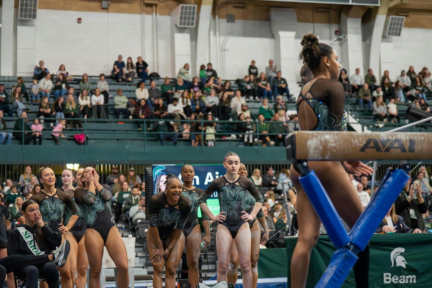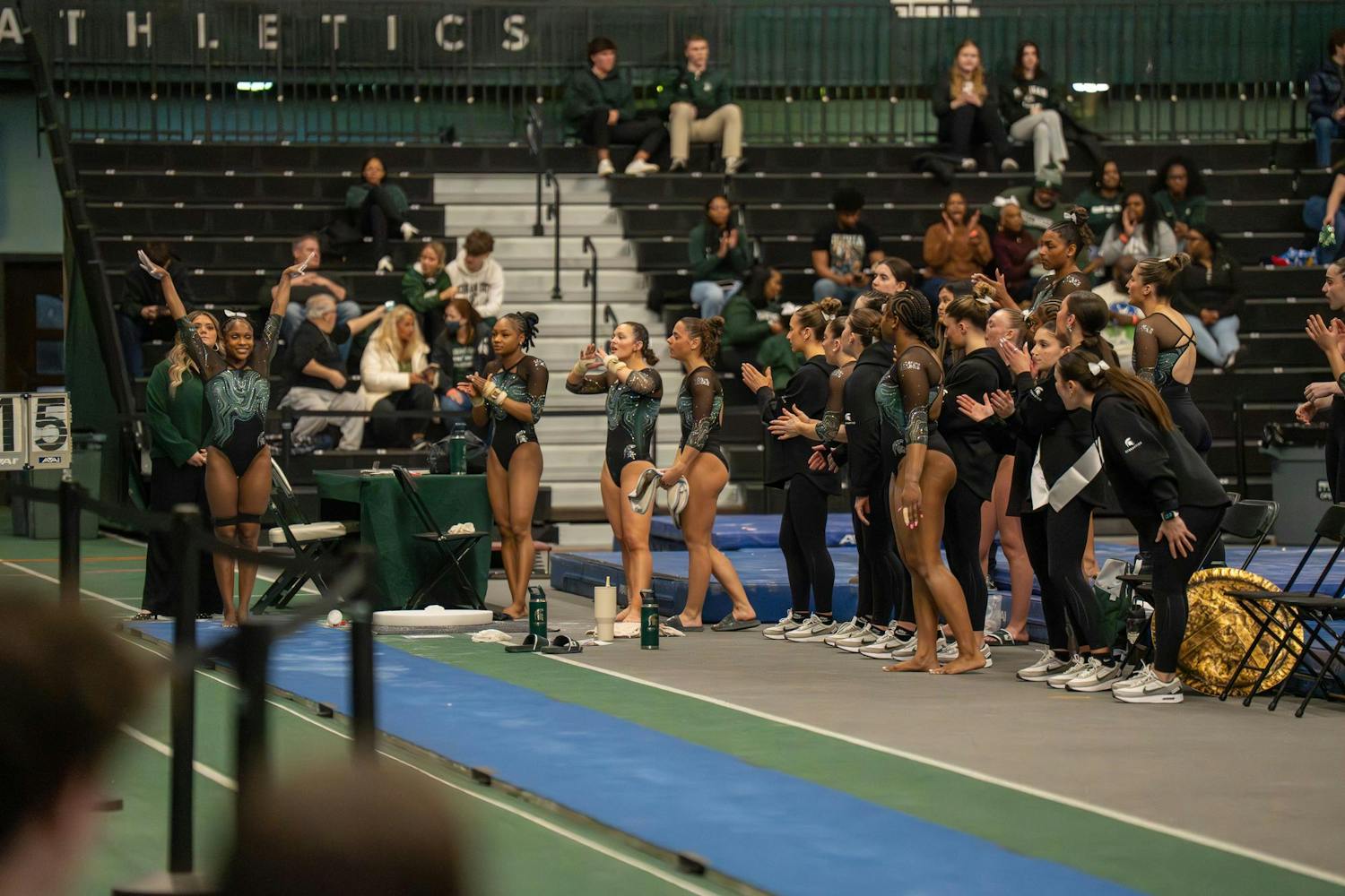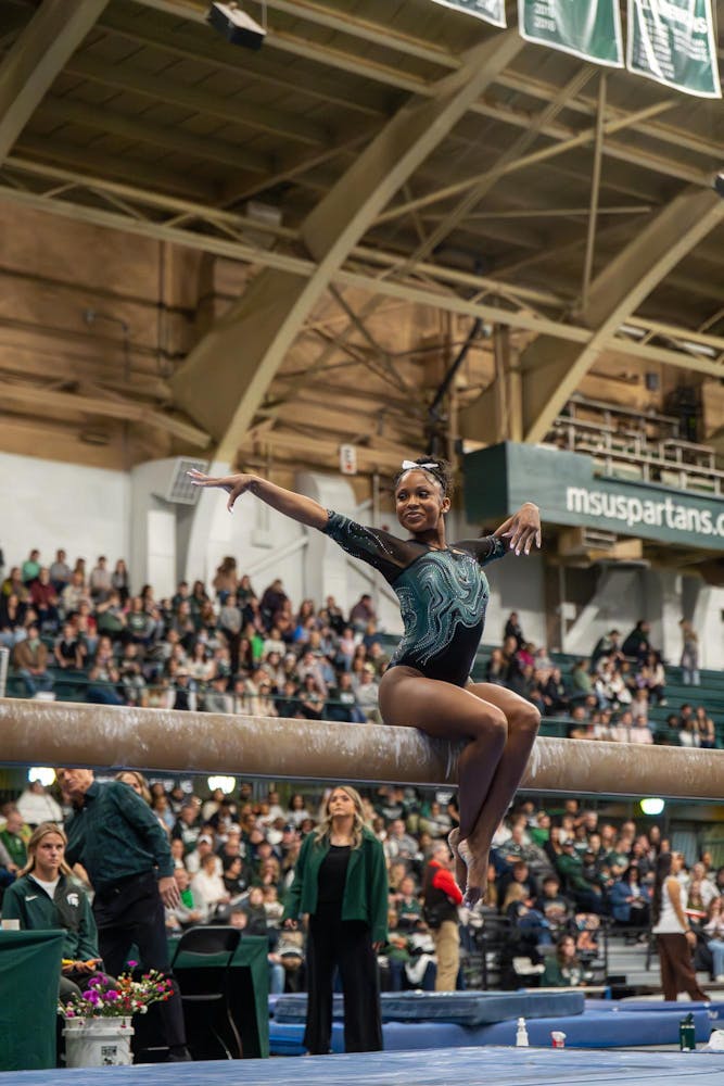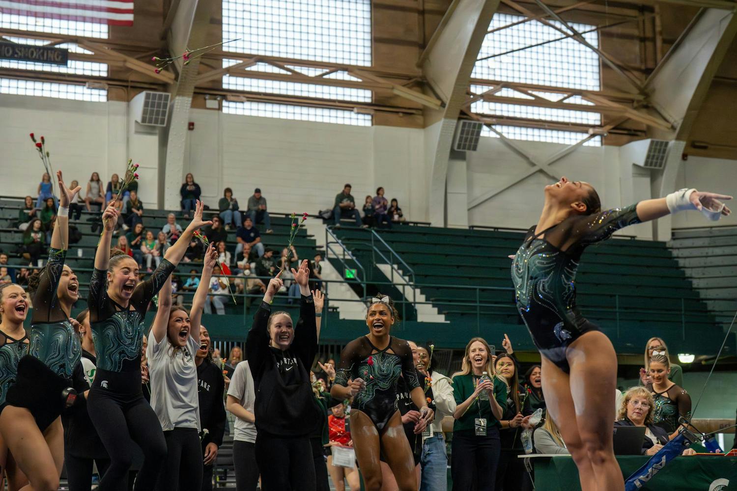 Michigan State gymnastics hosted Brown University for its Senior Night meet at Jenison Field House in East Lansing, Mich., on Sunday, March 15, 2026. The night honored Spartan seniors while the team competed across vault, uneven bars, balance beam and floor, highlighted by strong routines and celebrations with teammates and family.