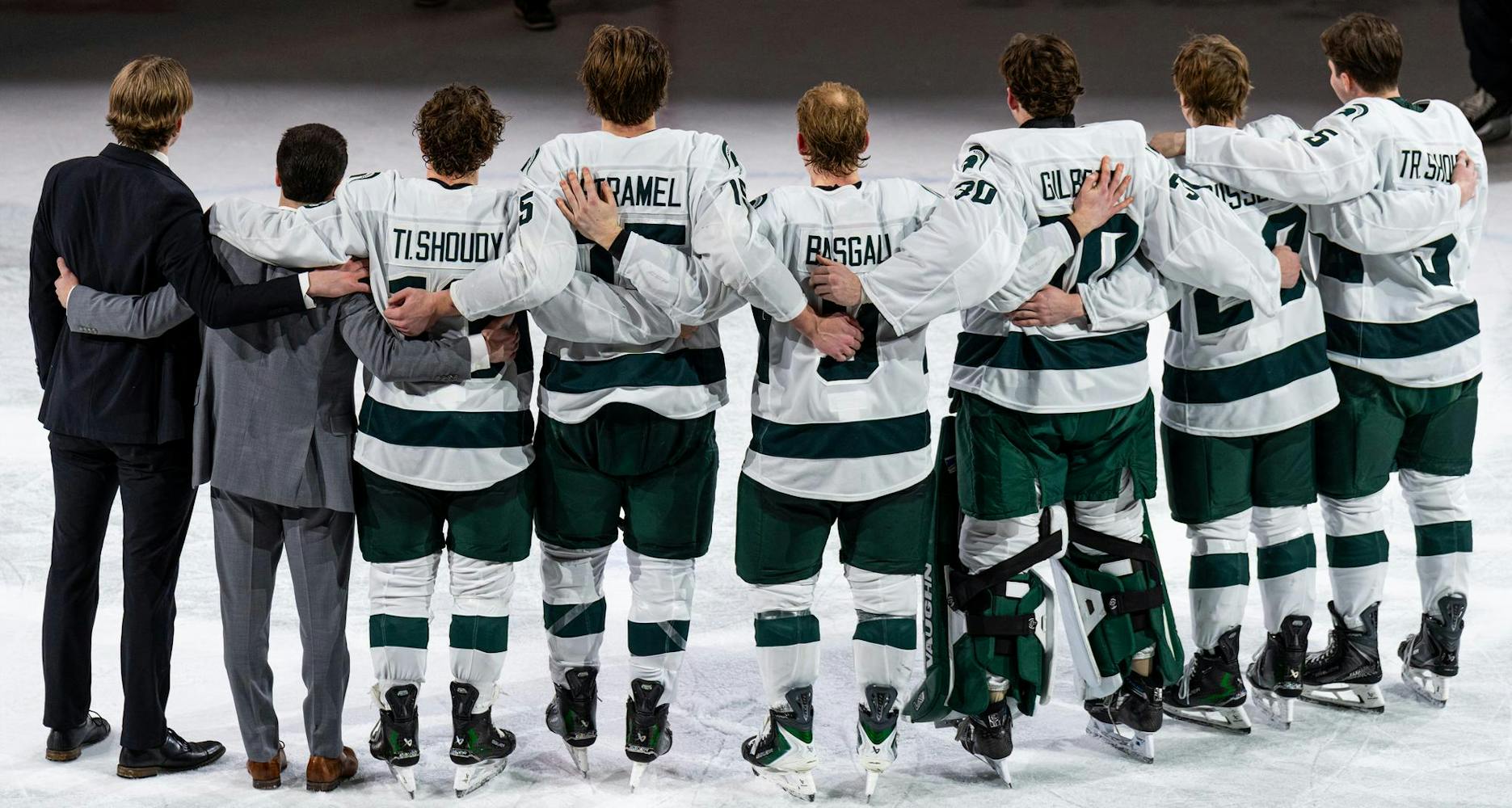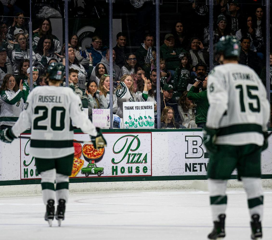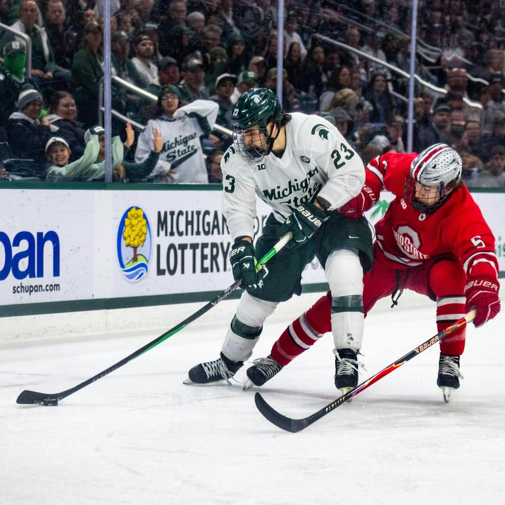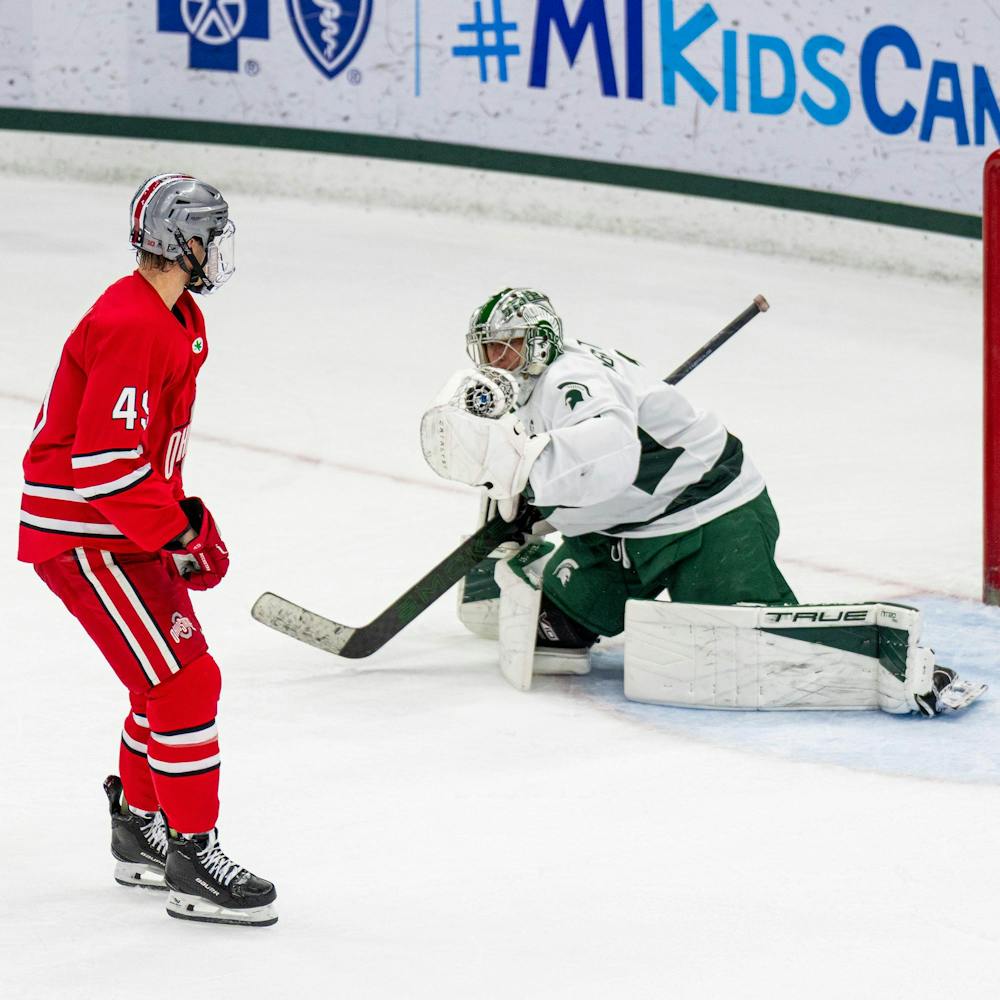 Michigan State University's hockey team barely managed to beat Ohio State on their senior night in Munn Ice Arena in East Lansing, MI on Feb. 28, 2026. MSU won after ending in a tie, 3-3, in regulation and OT then proceeded to a 12 round shootout before eventually winning the game.