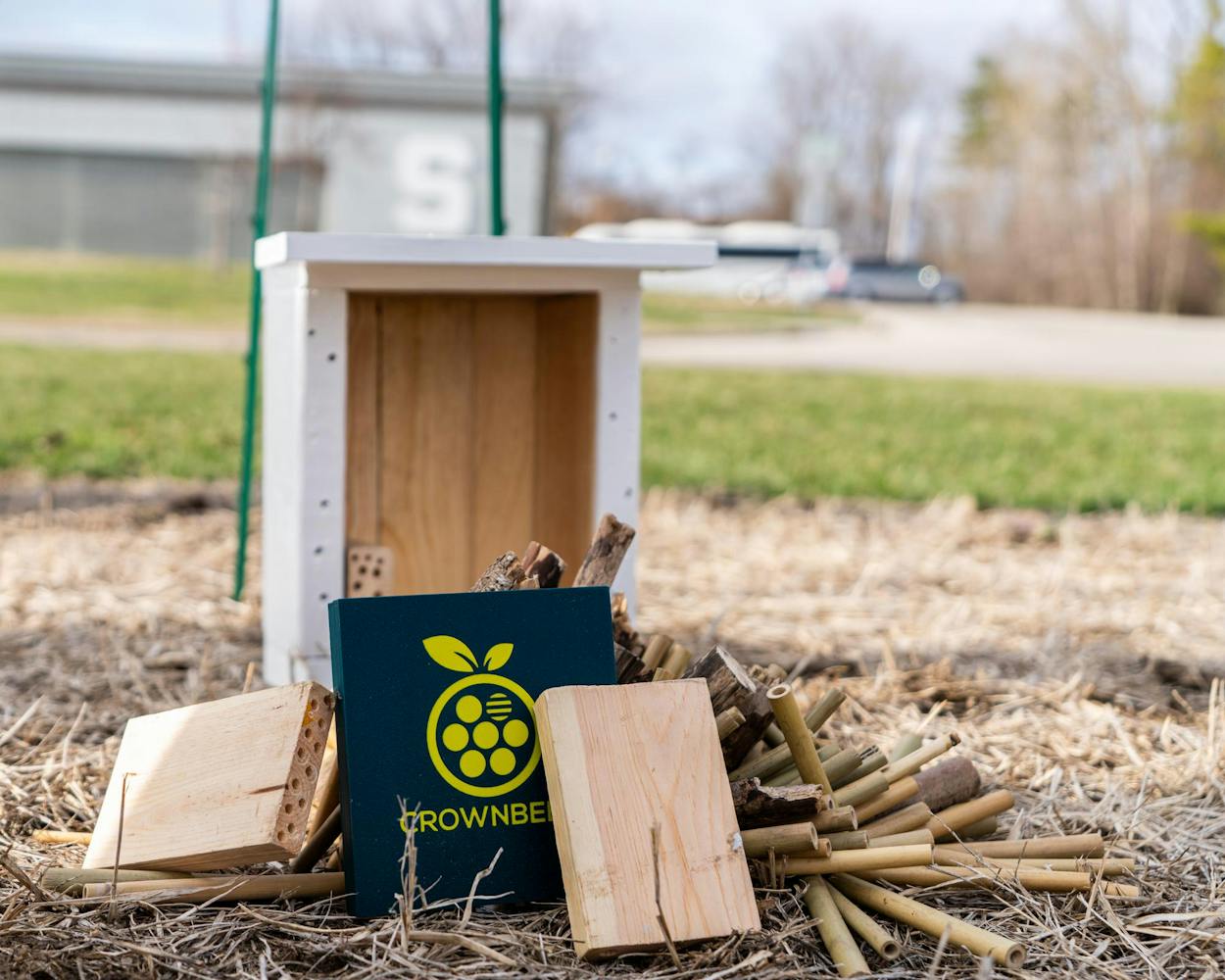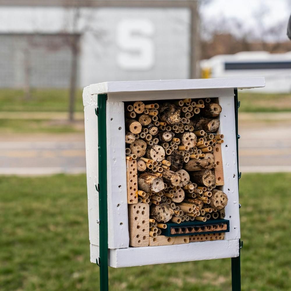 The Michigan State University Pollinators club installs a 'Bee Hotel' on MSU's campus on Service Road in East Lansing, MI on April 1, 2026. The hope of the hotels is to give non-invasive bee species places to inhabit as invasive species and other wildlife pushes them out of current habitats. The organization plans to install two more hotels within the coming weeks.