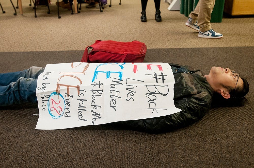 Undecided sophomore Tao Sun lies down in the middle of the floor Dec. 7, 2014, during a die-in protest at the MSU Library. A group of students blocked the entrances and walk ways in the library and marched afterwards in protest of police violence against black people while other MSU students were present to study for finals week. Raymond Williams/The State News