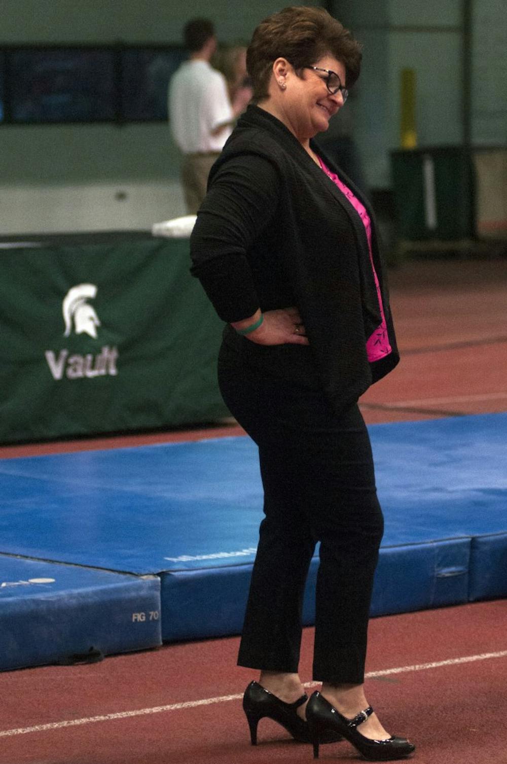 Head coach Kathie Klages smiles to her team Jan. 24, 2015, during the Breast Cancer Awareness Meet against Minnesota at Jenison Fieldhouse. The gymnastics team lost with a score of 196.875-195.750. Hannah Levy/The State News