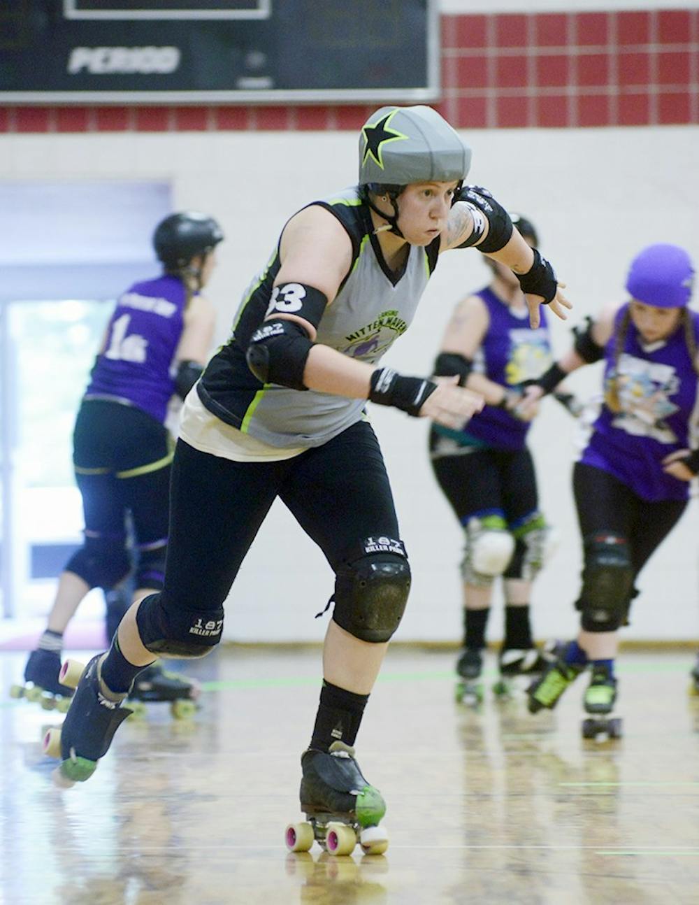 Samantha Perez, who goes by "El Gingero"for the Lansing Mitten Mavens Roller Derby team, gets out in front of the defense during their match against the Bath City Roller Girls on June 20th, 2015 at Court One Training Center in East Lansing. Wyatt Giangrande/The State News