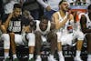 From left to right, redshirt junior forward Kenny Goins (25), freshman forward Jaren Jackson Jr. (2) and redshirt senior forward Gavin Schilling (34) react to a play during the game against Notre Dame on Nov. 30, 2017 at Breslin Center. The Spartans took down the Fighting Irish, 81-63.