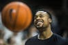 Sophomore forward Nick Ward (44) smiles while warming up before the game against Notre Dame on Nov. 30, 2017 at Breslin Center. The Spartans took down the Fighting Irish, 81-63.