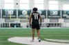 Michigan State graduate student AJ Arcuri taking off during Pro Day on-field position drills, on Mar. 16, 2022 at the Duffy Daugherty Indoor Football Building.