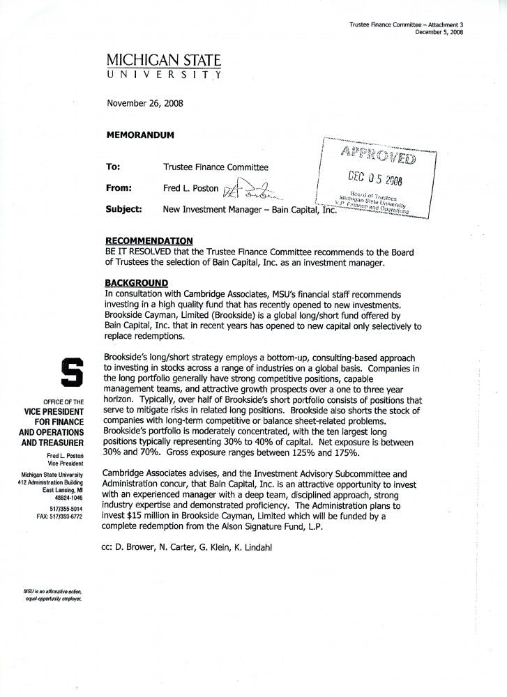 The MSU Board of Trustees voted to invest more than $42 million in Bain Capital stocks and private equity in 2007 and 2008 during the same time Mitt Romney’s brother, Scott, served as a trustee — which some experts said could be a conflict of interest.