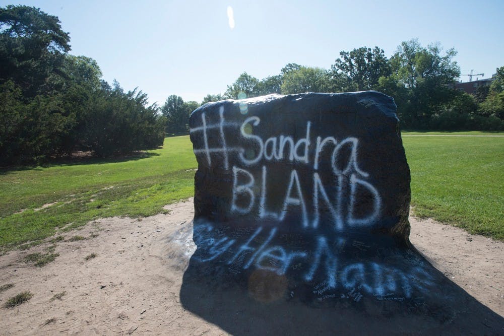 Nearly 50 students and representatives from campus organizations camped out from midnight to 8 a.m. on July 27 at the Rock on Farm Lane to protect a tribute to Sandra Bland after the first was painted over within less than a day.