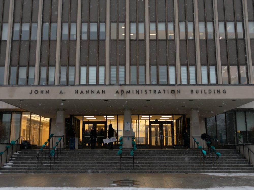 Protestors gathered outside of Wharton Center at MSU President Kevin Guskiewicz's investiture event, demanding divestment. Holding signs that read "STOP FUNDING GENOCIDE" and "BLOOD ON YOUR HANDS," protesters chanted "Kevin, Kevin you can’t hide, you are funding genocide."