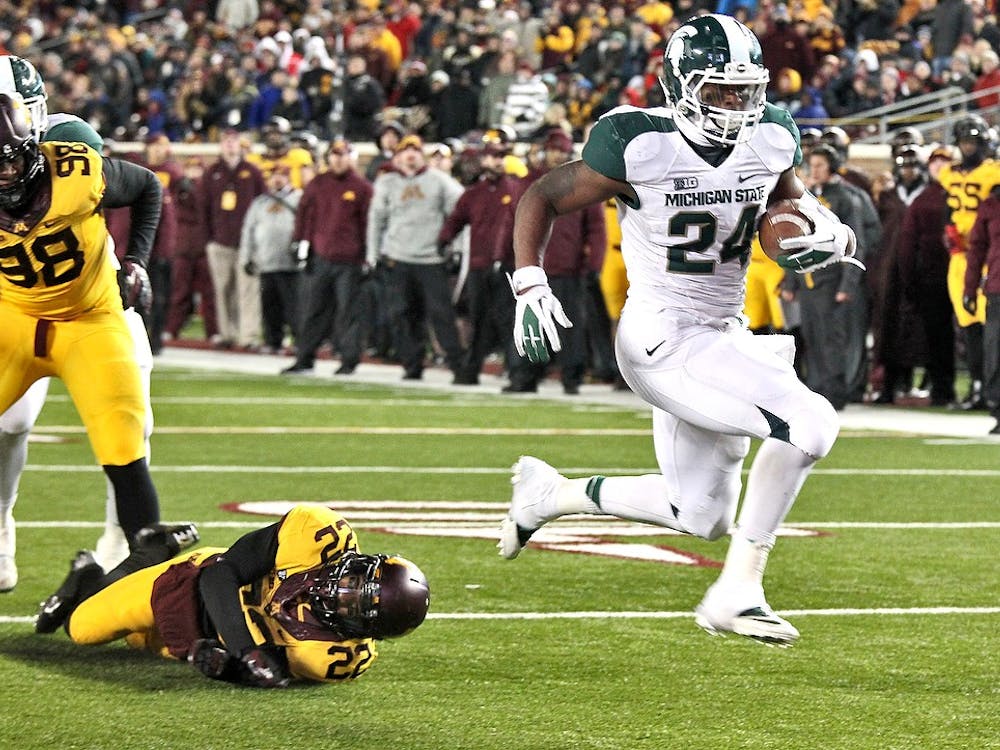 Before a national audience in the first game of the season, Bell established himself as the Spartans’ main offensive threat, carrying the ball a 2012 NCAA single game-high 44 times for 210 yards and MSU’s only two touchdowns.