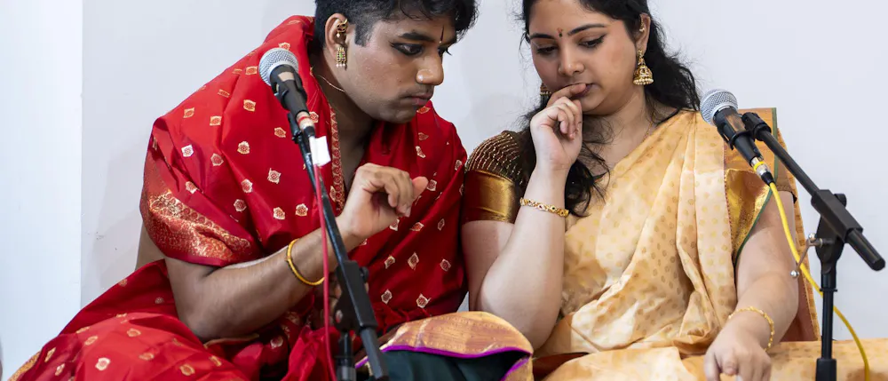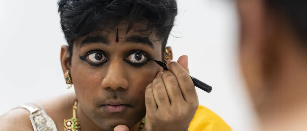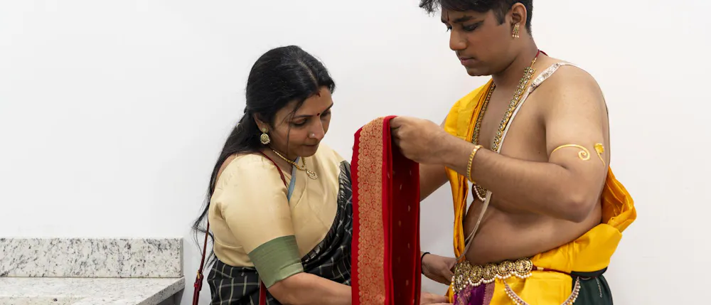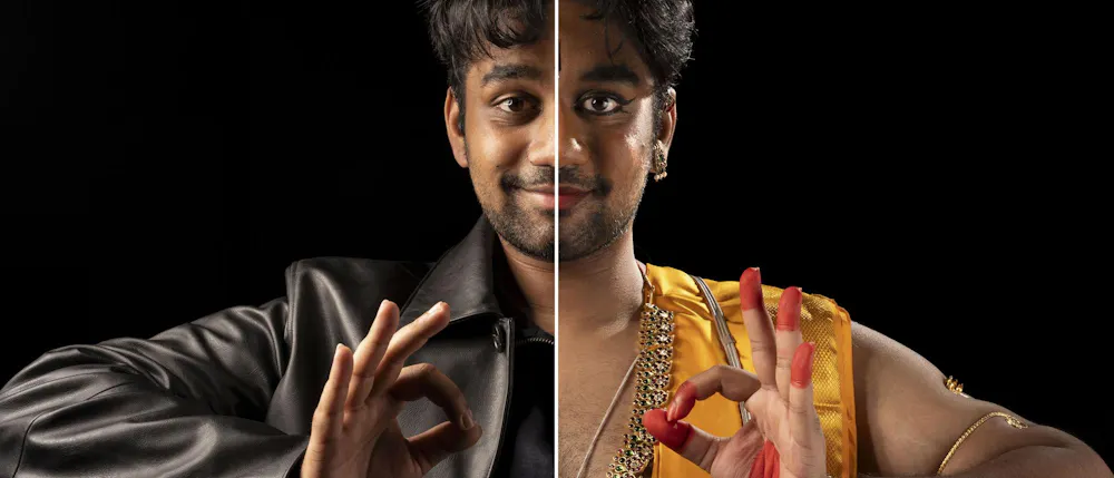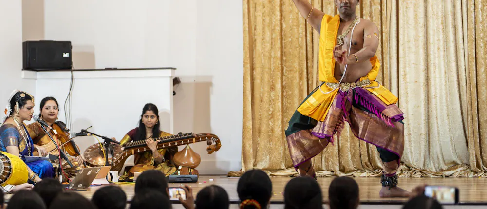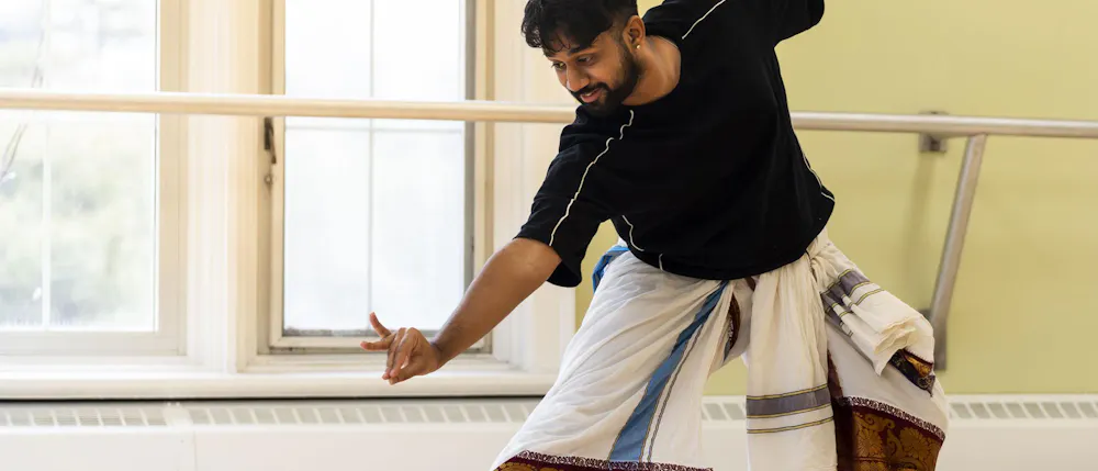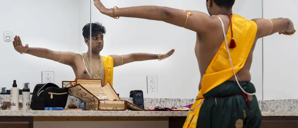 Biochemistry senior Abhinav Anand performs an original dance at the Sri Sharadamba Temple in Farmington Hills, Mich. on March 8, 2026. Anand dances in the south Indian Bharatanatyam style reacting ancient Hindu myths with modern-day contexts. As a man in a traditionally feminine art form, Anand finds his identity through his art and the support from his friends and family.