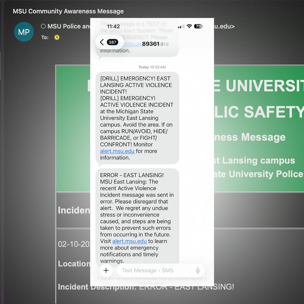 For some, the word "drill" was omitted from the initial alert they received, causing them to fear an actual active violence incident was occurring. That notification plainly read, "Emergency! Active violence incident at the MSU East Lansing Campus. Avoid the area."